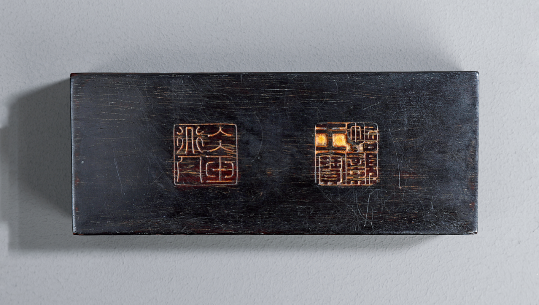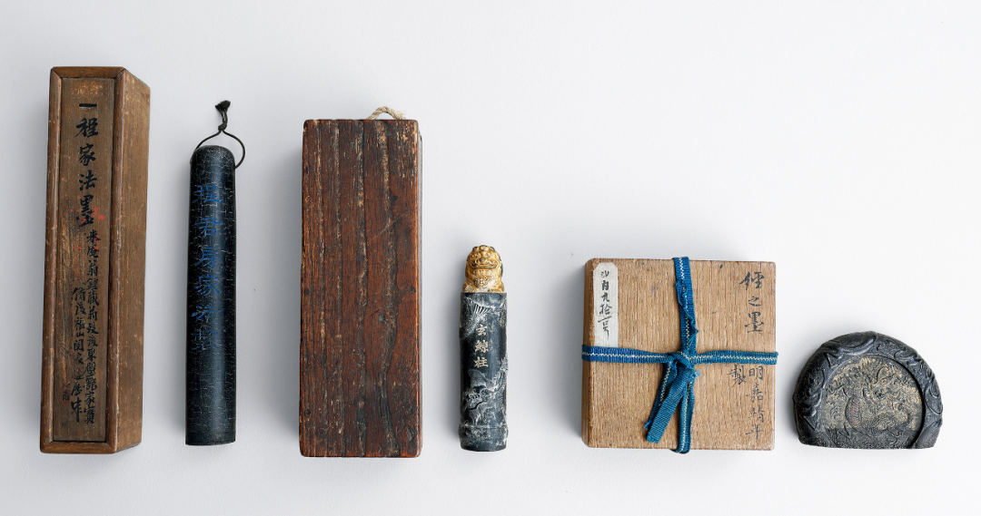 玄长:13.5cm;程长:19.5cm;经宽:10cm此三方墨造型图案各异,多姿曼妙,每一方都精雕细琢,匠心独具。经之墨略成圆形,式样似瓦当,两面中央为凹入的圆盘,一面饰一四爪龙,另一面则以篆书阳刻“经之墨”三字。边缘部分饰浮雕螭龙纹。程家法墨圆角方柱形,通体光素,色漆黑,上刻“程君房家法制”字样,笔法圆润,功力深厚。玄鲸柱墨上面端坐一金光灿然的狮子,抬首正视前方,正气凛然不可犯,墨柱雕下方雕海水,一鳞甲鲜明的玄鲸缠绕其上,虽只见首尾然气韵自显。此三方墨,方寸之地工艺亦是各不相同,或雕出惟妙惟肖之图景,或刻洋洋数言,描金、涂蓝各有风采。