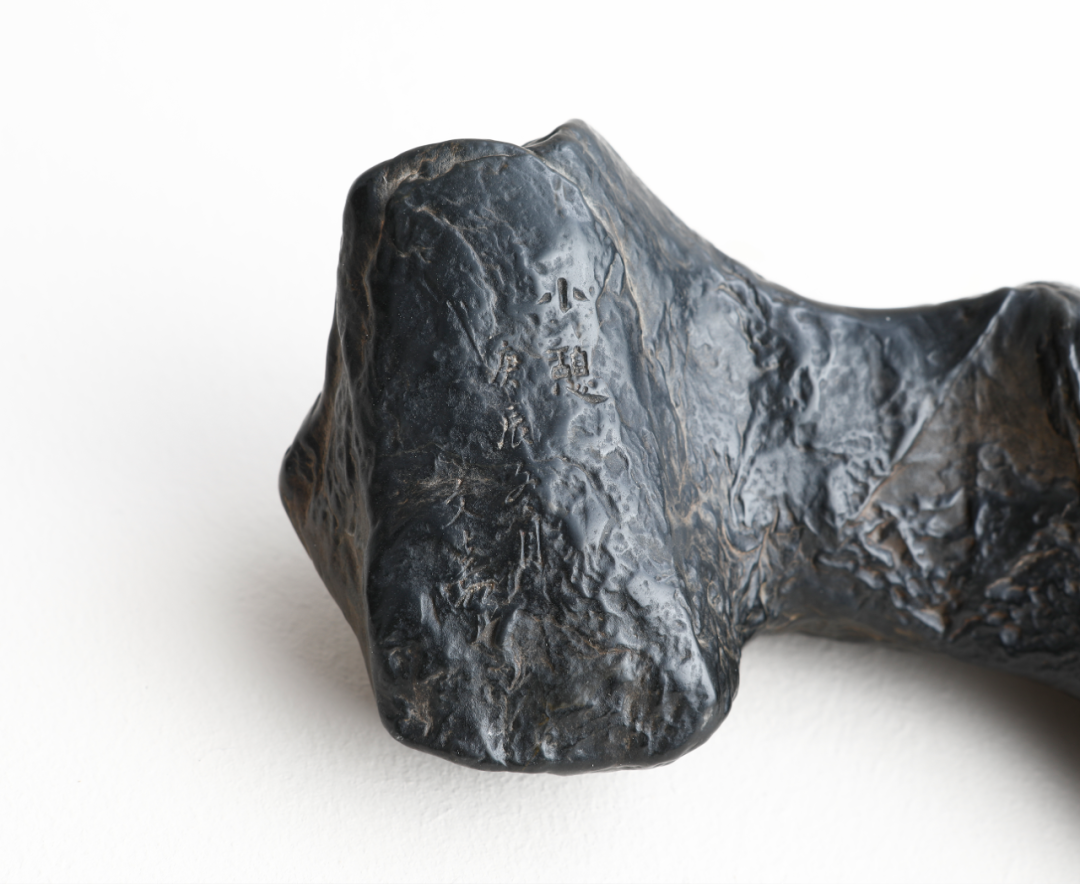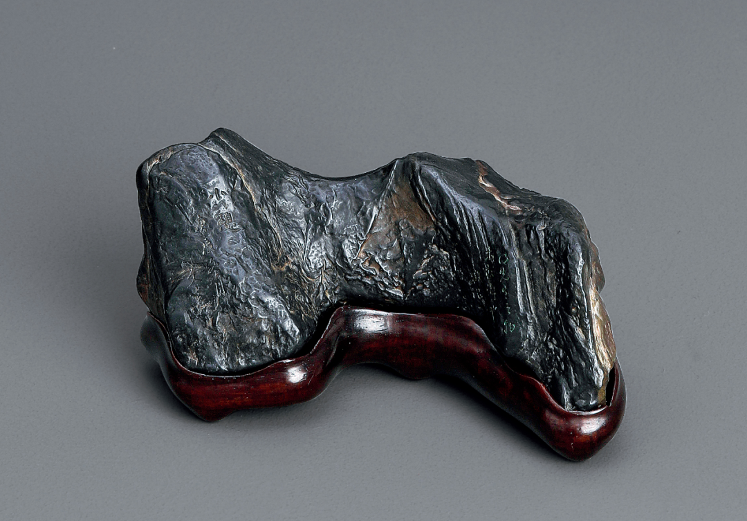 题铭:小憩,庚辰冬月,文嘉。得先生之物未□□也,征记。灵璧一拳,卧峰式,皮壳干洁温润,较为凝重,包浆油亮。想历代主人应该也甚爱此石,时时把玩。又如横云绕山,顿觉咫尺千里,意向无穷。山峰又略分为三峰,远近布局,隐隐而起,前后错落,风姿之美,不输于真实山水。山背团圞,腻光欲滴,布满核桃壳纹,一侧山脚露出白灵璧一点,如同山谷苍云欲发,暗含机巧,宋意十足。有题铭两处:「小憩,庚辰冬月,文嘉。得先生之物未□□也,征记。」