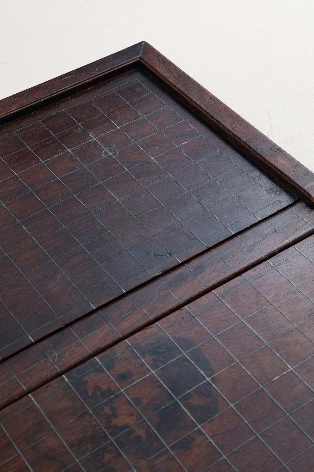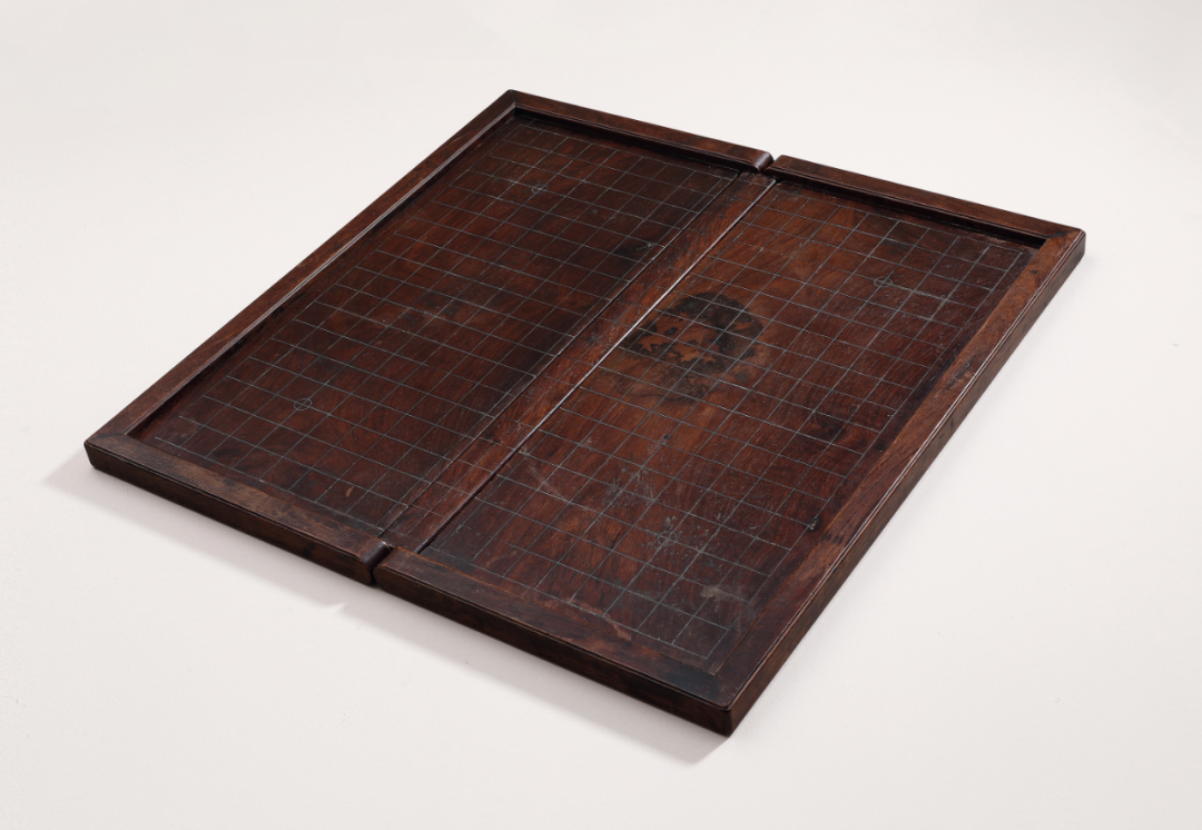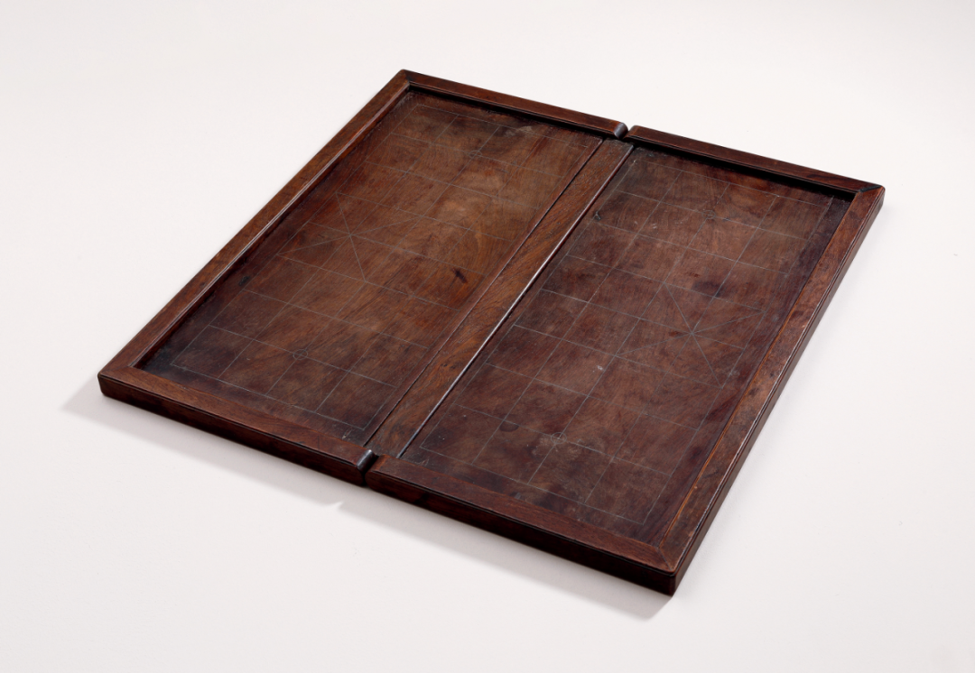 此盘以黄花梨格角攒边而制,保留原皮壳,用料精致,结构严谨。中间宽枨状构件与棋盘面平齐安装,并因此将之隔为两半,构件两端出双轴头,纳入边框之内。棋盘一面为象棋格,一面为围棋格,相应的两个对边,自中间一分为二,各与枨状构件轴头相合,并可以围绕轴头折叠。另在两个对边靠近轴的一段安装铜饰件,中间连以铜片,暗藏圆轴,使得两个对边形成双轴旋转折叠的效果,设计科学合理。此棋盘为文人雅士携棋访友实用之器,甚为少见,久经传承,愈见古拙,有淡雅清逸之意趣。