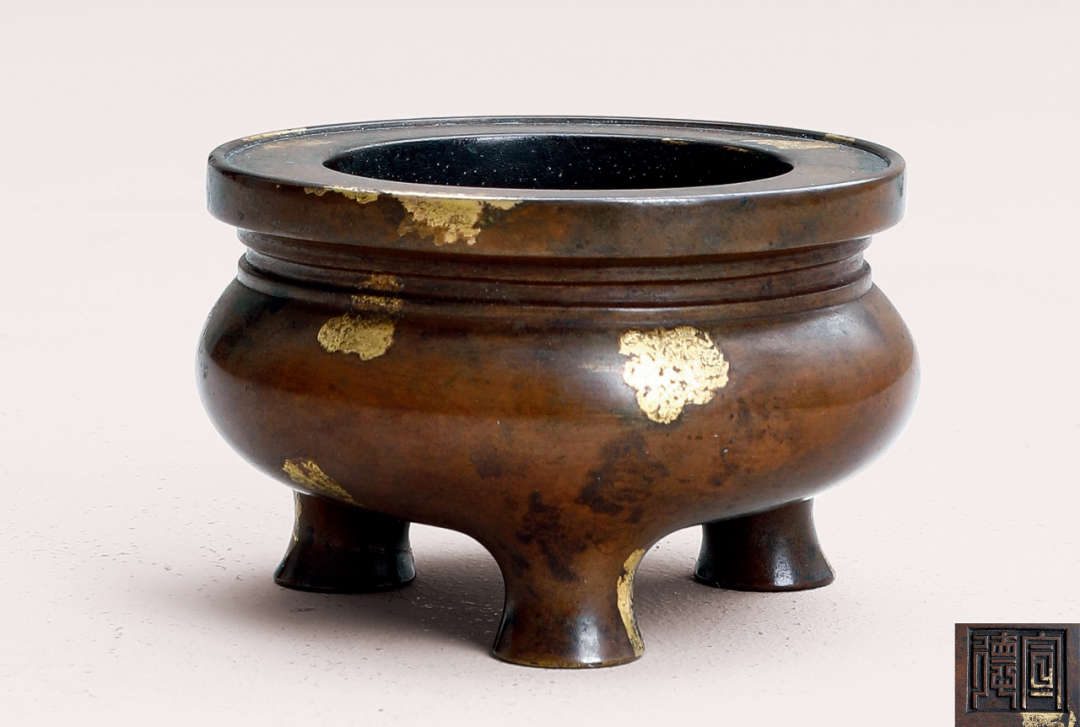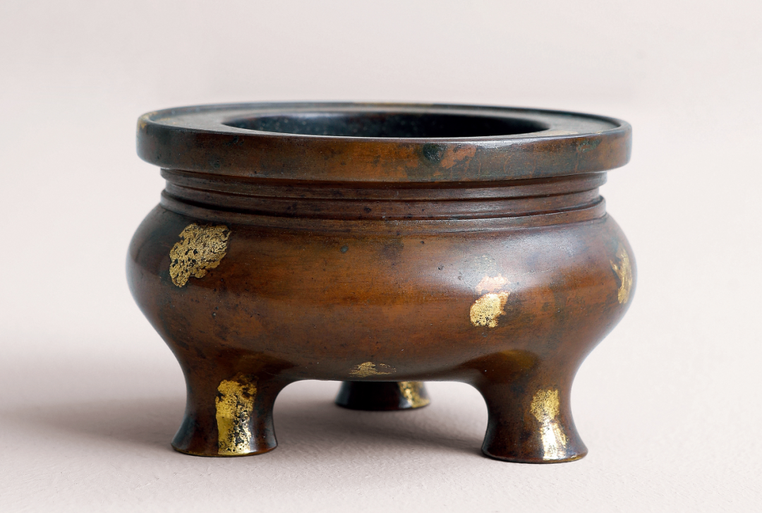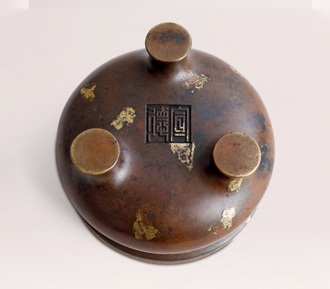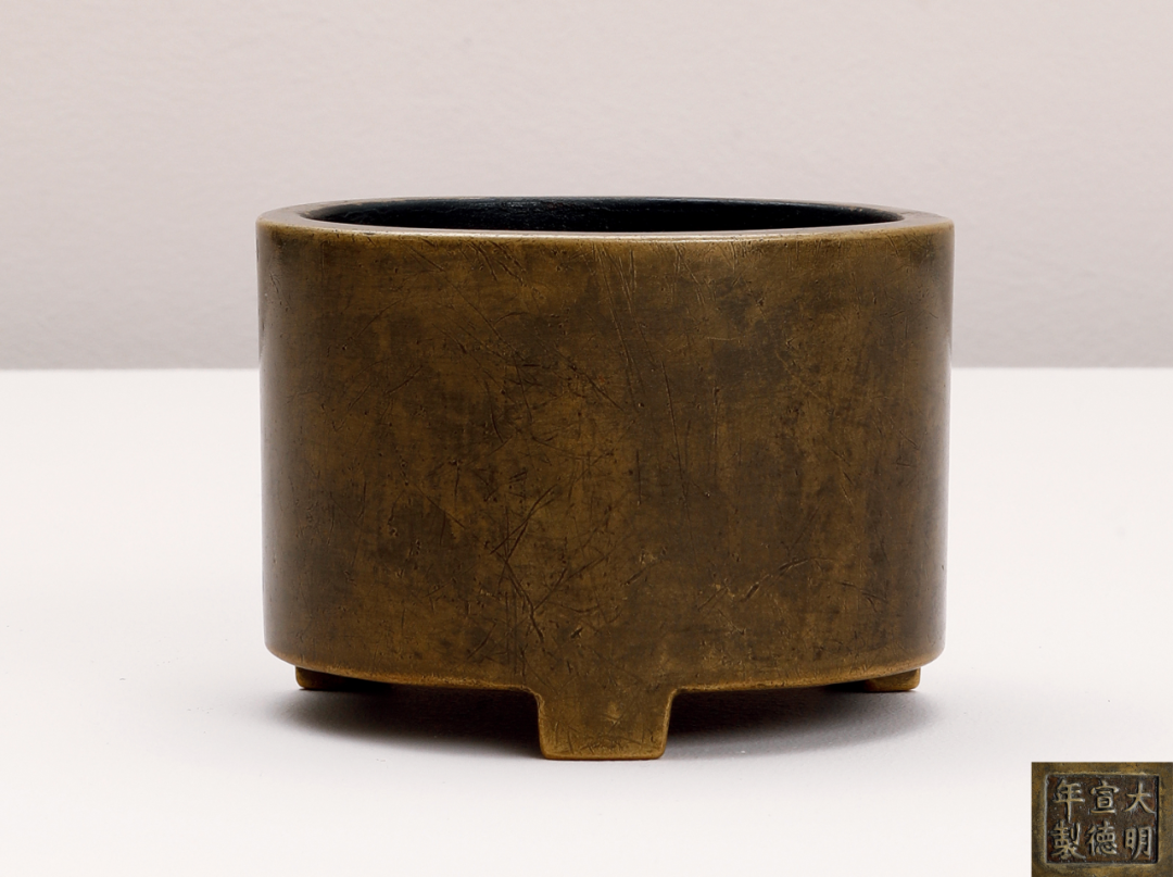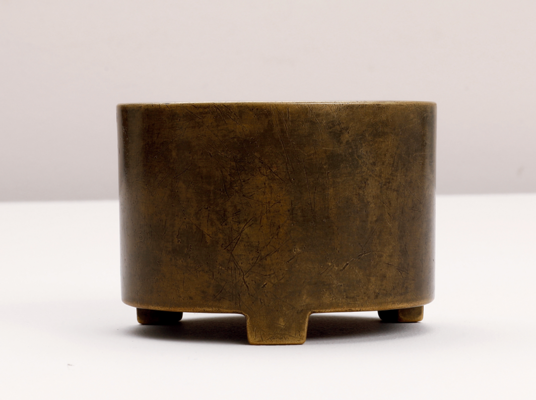 炉以精铜为料,用心铸制,铜质经多次反复淬炼,精纯细腻,可堪比黄金。炉色古灿,包浆莹润,微泛栗色。炉口平口内敛,炉身近乎直璧,深腹下微收,三足。炉身素面,不琢纹饰,古雅脱俗。底铸「大明宣德年制」六字三行楷书款,笔画的转折顿挫,严谨有度,字面铸后精修。