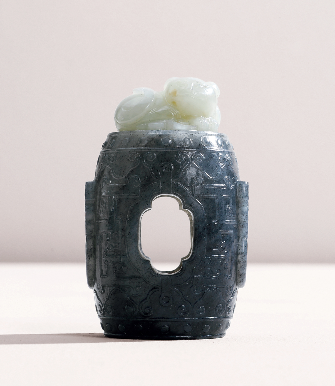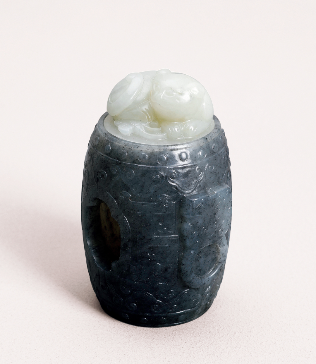 此玉器选料独特,选用白黑玉为材,玉色上白下黑,分界利落,玉质温润细腻,圆雕工艺精湛,保存完好。巧用上半部分白玉俏色雕琢出一只卧猫,下半部利用黑色雕琢一个鼓墩。鼓墩上下两端边沿装饰弦纹及乳钉纹,主体饰如意纹,中部开窗镂空。猫形肥硕,卧于墩上。前足蹲踞,后足卧于体下,尾卷起于一侧。猫首侧转正视,双耳竖立,双目圆睁,胡须微张,神态悠然。雕琢刀法精致细腻,鲜活饱满,五官、鬃髪、肌理、爪趾皆栩栩如生,着重突出其神态与情趣,颇为精致,创意独具。