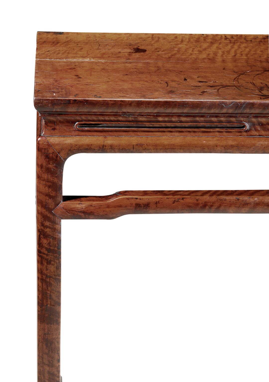 1.马科斯弗拉克斯(Marcus Flacks)旧藏条桌以龙眼木制成。龙眼木是福建地区家具常用材料,果实即“龙眼”,属于果木类,其纹路细节光滑,往往有明显的水波纹、虎皮纹,妍若火焰,质如琥珀,具有很强的装饰性,闽人多以之制作桌案床柜。桌面不采用攒框做法,而是以厚独板一块斫成,也不设抹头,侧面做敛入较多的冰盘沿,下方翻碗口线。这种独板面做法显然材料很是充裕。束腰打洼,上设笔管式开光,开光沿边起阳线。直牙条,两头有弧嘴,挖去较多,边线锐利,若一蹴而就。矩形腿足,肩部微耸,下方挖内翻马蹄,马蹄只是翻出少许,下方又外撇形成两层倒梯形,宛若柱础。腿足间连以罗锅枨,曲线柔婉,与腿足以大格肩榫相接。![]()