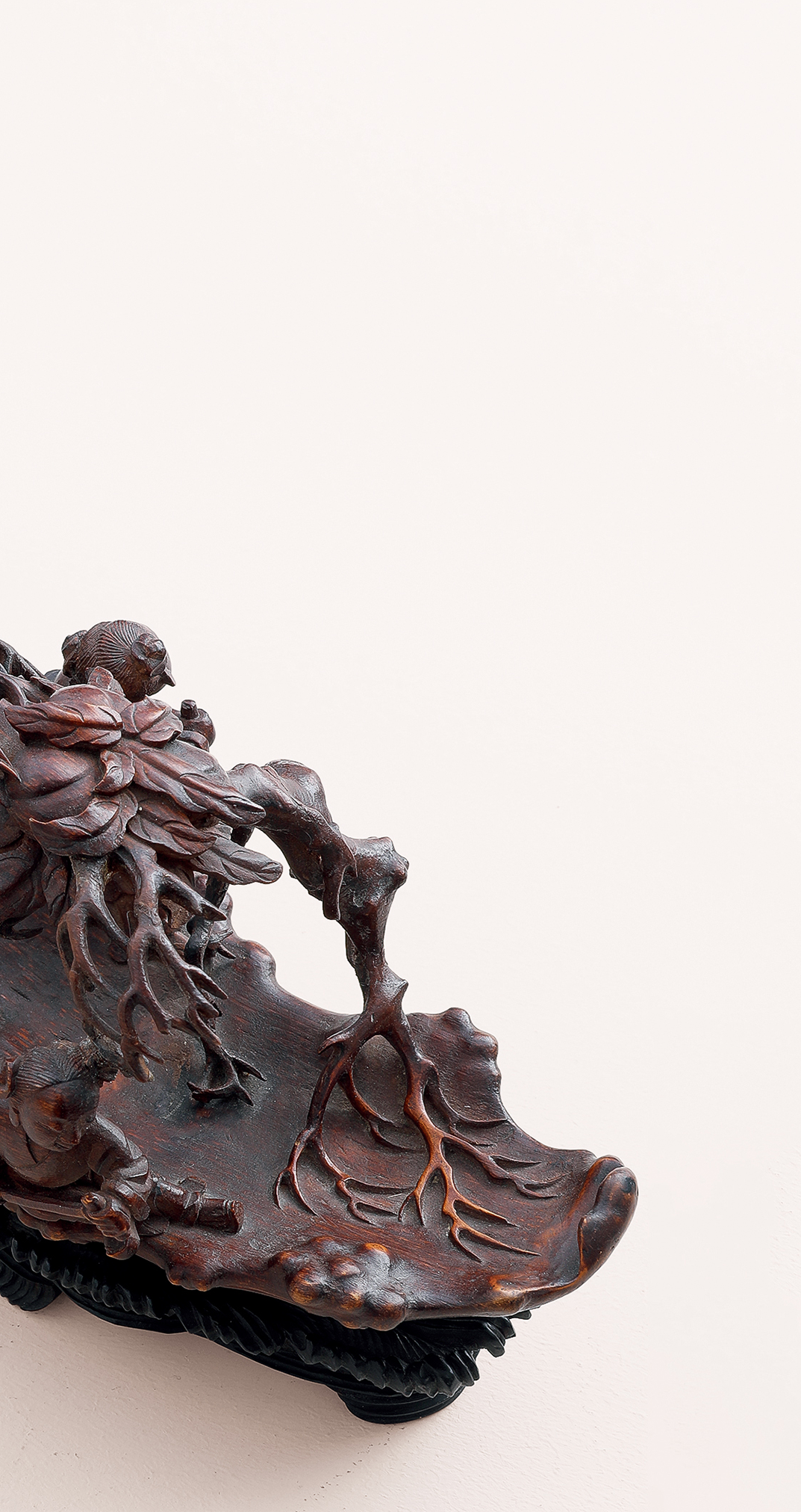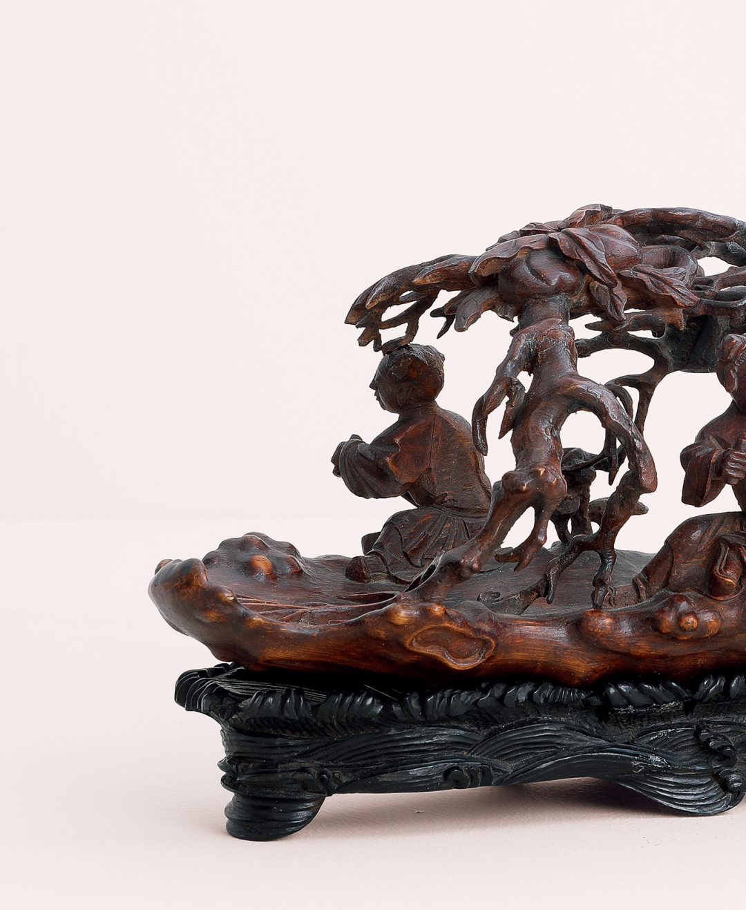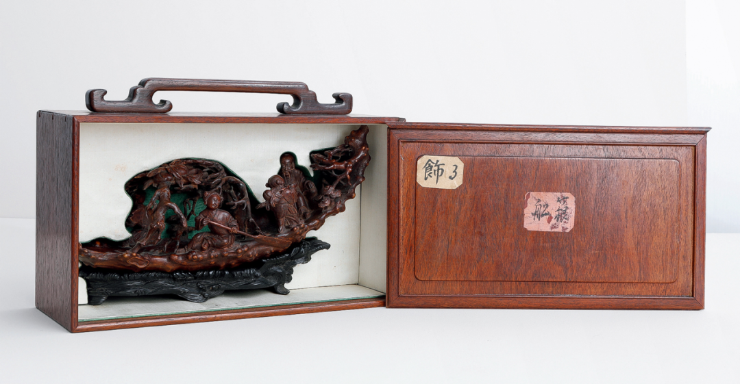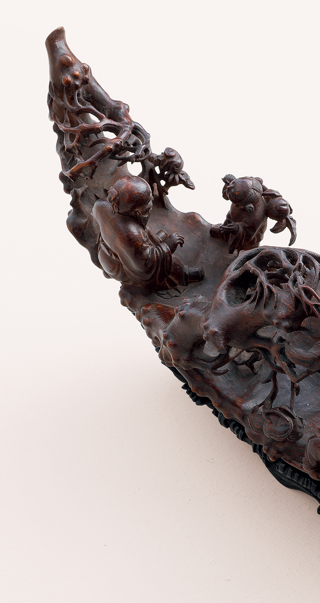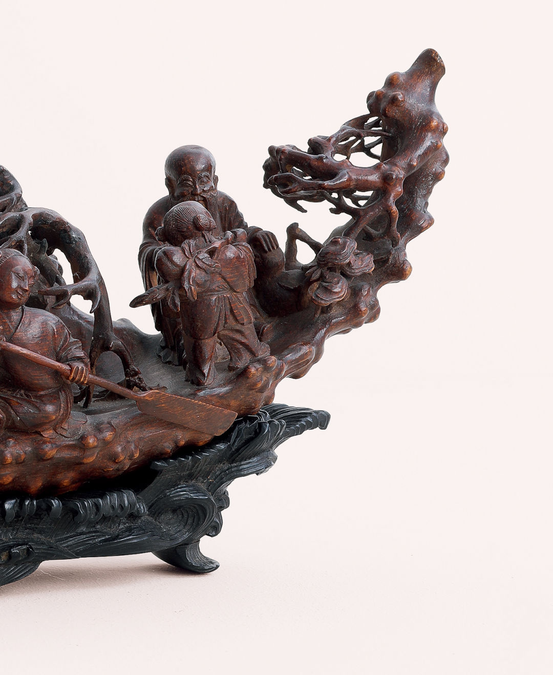 竹雕在中国历史悠久,先秦时代即已萌芽,长沙马王堆汉墓出土的彩漆竹勺,柄部饰以编辫纹及龙纹,雕镂已极精致。日本正仓院藏唐代尺八,用留青法在竹面上浅雕仕女花树禽鸟飞蝶,宛然如画。竹有君子之称,制为器物也极富雅趣,备受士大夫青睐,故文人诗词笔记中往往有赞叹竹器之语,可惜竹木易朽易裂,少有耐久者,故传世古竹器难得一见。竹雕技艺真正成熟是在明中期以后的江南一带,清代金元钰《竹人录》记载嘉定朱松邻、金陵濮仲谦以竹雕名世,鉴赏家不惜重价求购,从学者众多,遂成风潮。尤其朱松邻之子朱小松,其孙朱三松亦以治竹擅名,号「嘉定三朱」,入清以后,嘉定一派又有吴之璠、朱文友、封锡禄、周芷岩等名工涌现,影响极为深远。此件清早期竹雕仙人乘槎船,系日本藏家旧藏,承袭朱松邻嘉定一派刀法,以圆雕和高浮雕深刻物象,刀法峻利,层次分明,雕琢入微。嘉定竹刻以生动精微着称,竹根之材天然崎岖多变,较之浑圆的竹筒更难雕琢,也往往更富奇趣。清人咏朱小松所制竹根文具诗云:「藤树舞鳞鬣,仙鬼凸目睛。故作貌丑劣,虾蟆腹彭亨。以此试奇诡,精神若怒生。琐细一切物,其势皆飞鸣。」这件清早期的竹雕仙人乘槎船,也颇有诗中风采。以竹根天生蜿蜒形态,琢成仙槎孤舟,船身上生出枝桠,状若虬龙,枝叶间掩映仙桃灵芝,寓意吉祥福寿。船尾南极仙翁高额长须,手抚灵芝含笑倚坐,广袖曳地,意态闲适,一童子发梳双髻肩扛桃枝,昂首向仙翁笑语,憨态可掬。船头两童子相背而坐手持船桨奋力划动,配合雕出海浪纹理的乌木底座,仙舟漂浮海上,迎风破浪之状宛然如真,若可乘流直上天。这件竹根陈设,长不盈尺,而物象精微细密,人物形态生动,布置经营得当,虽琐碎细处,观之亦有神采飞扬之感,当为清初嘉定派高手精心佳作。表面包浆浑厚润泽,更觉古雅宜人。