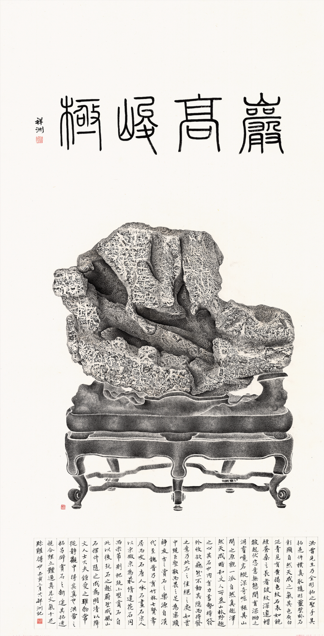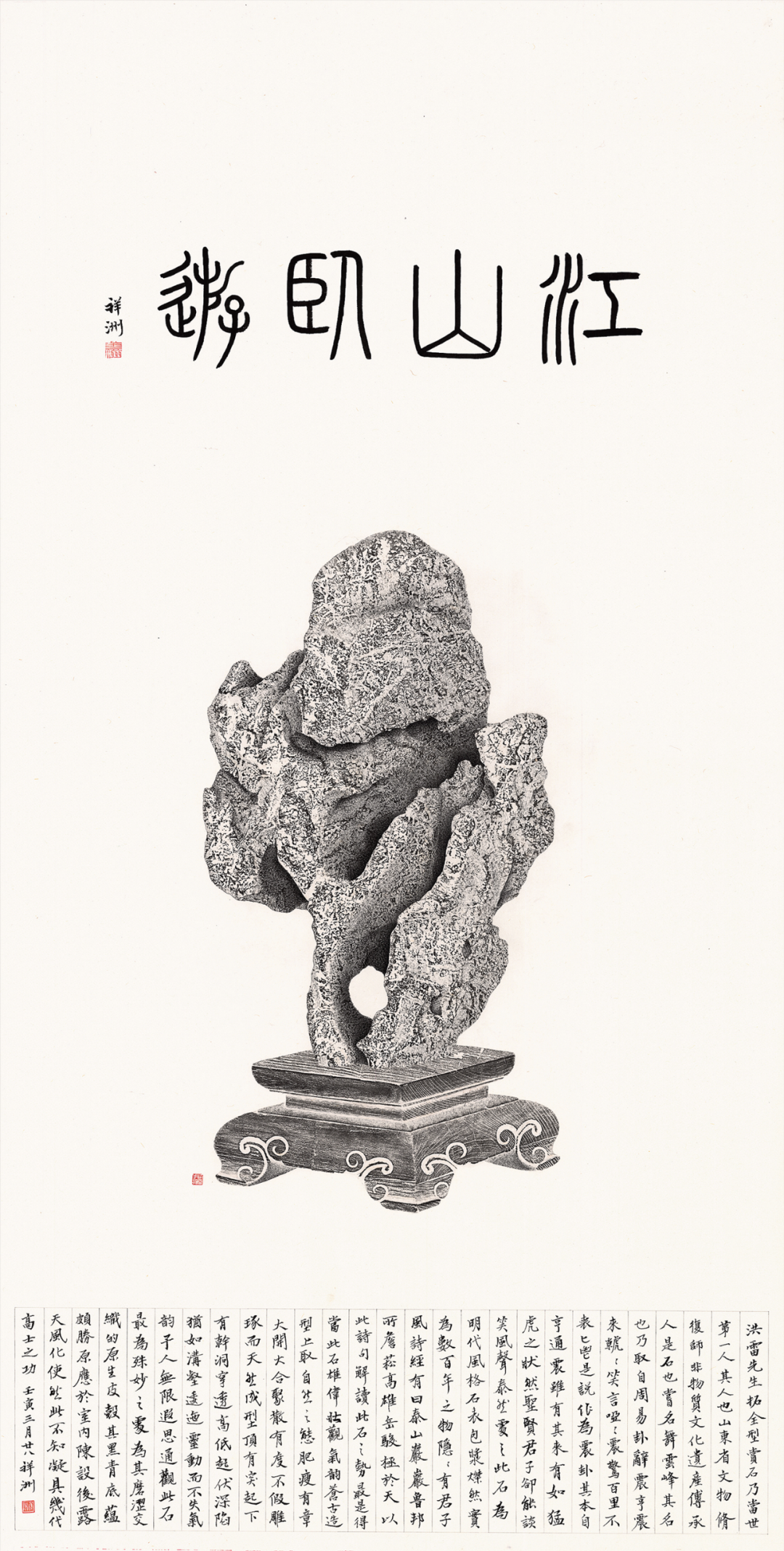 1.《造个院子过生活》,嘉兴吴越电子音像出版社,2020年,封底作品。2.《泗滨浮磬——古典灵璧供石特展》,华艺文化出版社,2020年,页31。古赏石之乐,源自汉代山林野趣,至唐遂有山水画而卧游其间,其乐亦然。明清文人将山水神格化,山石摆件随之也成为文人士大夫钟爱之雅物,常从静观自得的生活中体会到山水的美感。灵璧卧石随形而取,彰显自然天成之气,其色灰白泛青,见有黄褐色纹,石表如同一位饱经沧桑的老者,皴纹明显,褶皱起伏,恣意无态;间有深岰洞壑巉岩,纵深奇崛,极具山间之原貌,一派自然真趣浑然天成,暗和文人追慕山林野趣之心,为赏石中难得精品。张洪雷,非物质文化遗产传承人,知名全形拓艺术家,山东省文物修复师,鸿磊金石拓片艺术博物馆馆长。其作品器形准确、透视合理、立体逼真、文气十足,多次荣获工艺美术博览会金奖。