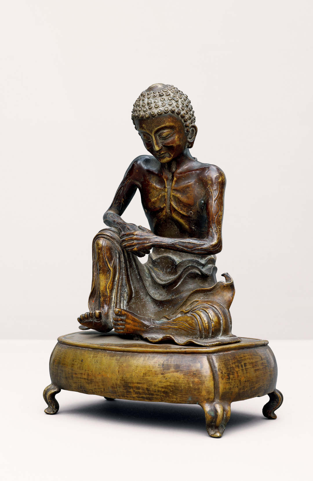 此像表现的是释迦牟尼佛未成佛前在雪山六年苦行的形貌;悉达多太子左腿横盘,右腿向前支起,赤裸双足,两手相叠置于右膝。身体羸瘦如何斯树,肉尽筋现,如坏屋椽,脊骨连露如筇竹节,眼目陷如井底星,头顶销枯如曝干瓠。头略垂俯,长目微合,双唇紧闭,似在沉思冥想。上身赤裸,仅以粗布裹体,裤脚飘扬,表现出所处环境清凛超然。此像在完美表达了佛陀苦行形象的同时,又很好的体现了佛陀的庄严法相。虽然是在苦修中,但佛陀没有愁楚痛苦,而是慈悲安详。虽然双颊下陷,但五官清秀,造型写实传神,极富艺术感染力。