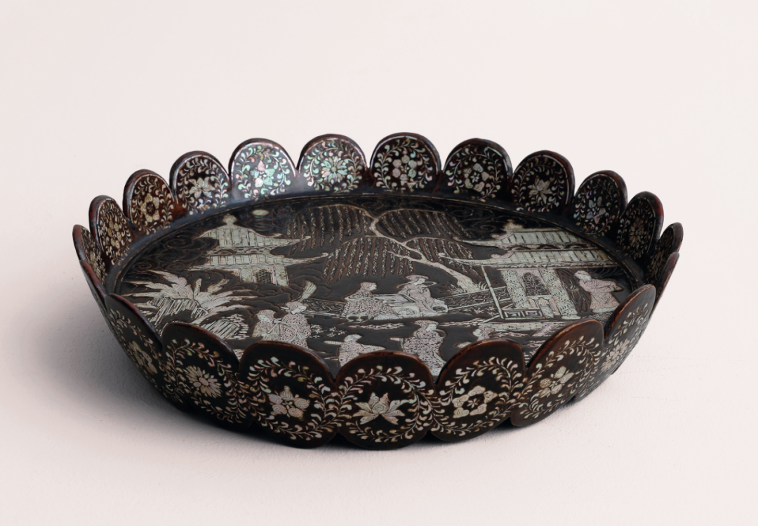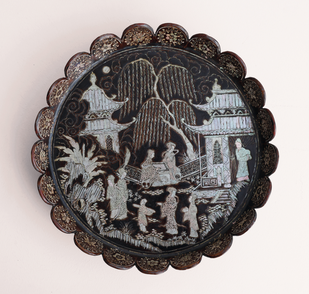 以螺钿装饰漆器的技术始自商代,早期都是格式化的图案,及至元明时期,设计渐趋复杂,出现了细节繁多、取材自绘画、戏曲和版画的嵌螺钿雕漆。关于嵌螺钿,林业强教授曾提到黑漆嵌螺钿的制造过程甚为繁复,“先将原料用水煮上数天或数周,撕成薄片,然后根据画好的图案剪成小块贴在器物表面,再在其上涂上黑漆,最后磨去表层漆料,便会显露螺钿嵌砌的图案”。本品即为佳例,盘造型殊特,呈圆形,外壁为二十一个连续的圆形相组,如盛开的花瓣,颇具新意。盘心嵌绘楼阁人物图景,祥云袅袅,垂柳摇曳,树石蕉叶。庭院中仕女三两成组,或下棋、或赏花、或交谈,又有一抱琴小童随侍在旁,衣纹嵌绘细腻,神态生动。盘内外壁接于中心嵌绘不同的花朵,卷草围绕,极富装饰意味。整器以薄螺钿为之,薄螺钿又称五彩螺钿,是取小贝壳之极薄的内表皮,这层内表皮即薄又硬,极难剥取,剥取之后用小镊子夹着磨制成所需形状,贴嵌在漆地上。还要根据图案要求巧妙配色,因此这类器物从不同角度欣赏,会有各种色彩变化,因而又称为五彩螺钿。此种技法难度和花费之高,可说是宫廷和民间工艺的分野。这种工艺在明代和清代早期最为宫廷与上流社会所推崇,清代中期后,随着国运衰退,此种工艺几乎已经难得一见了。