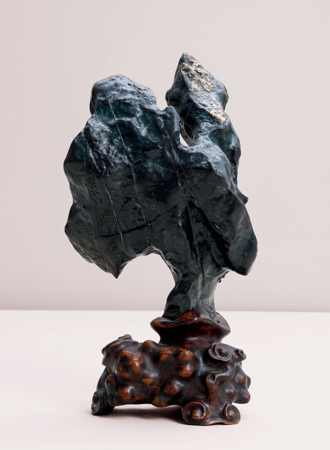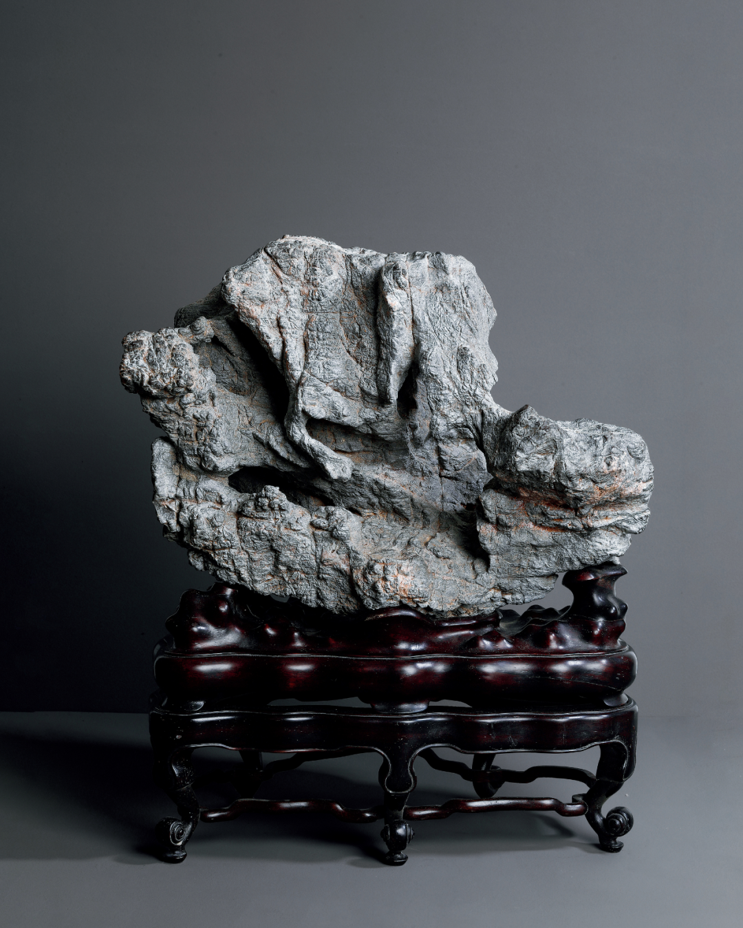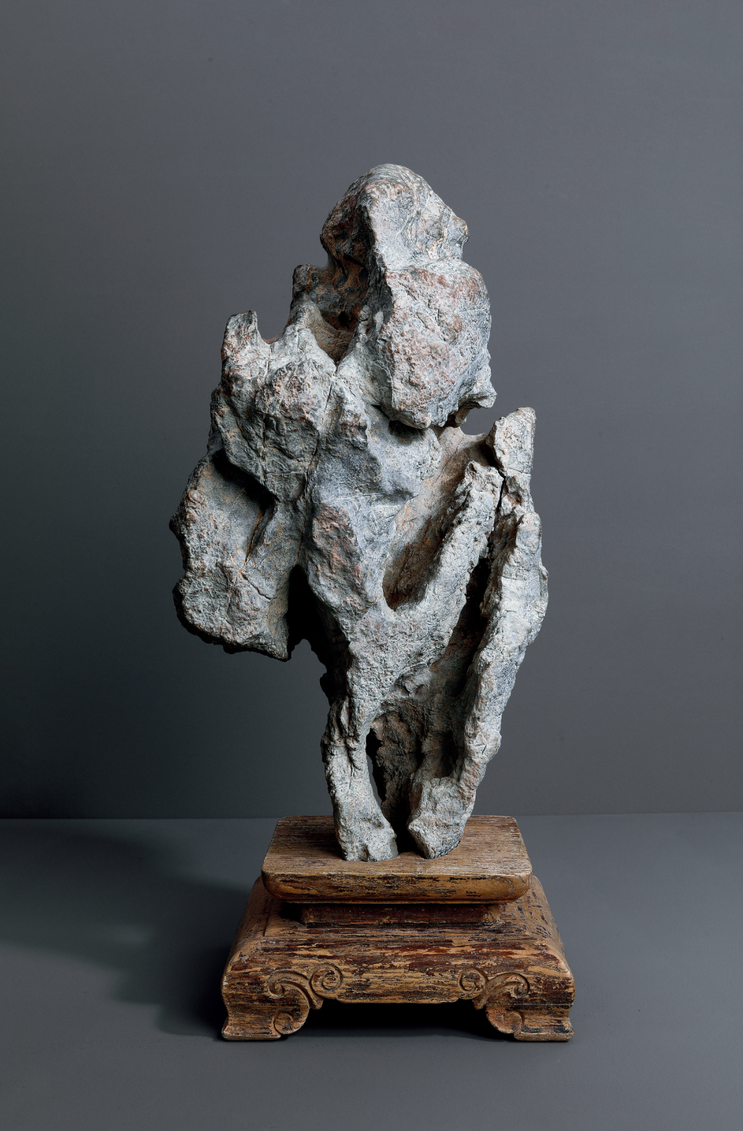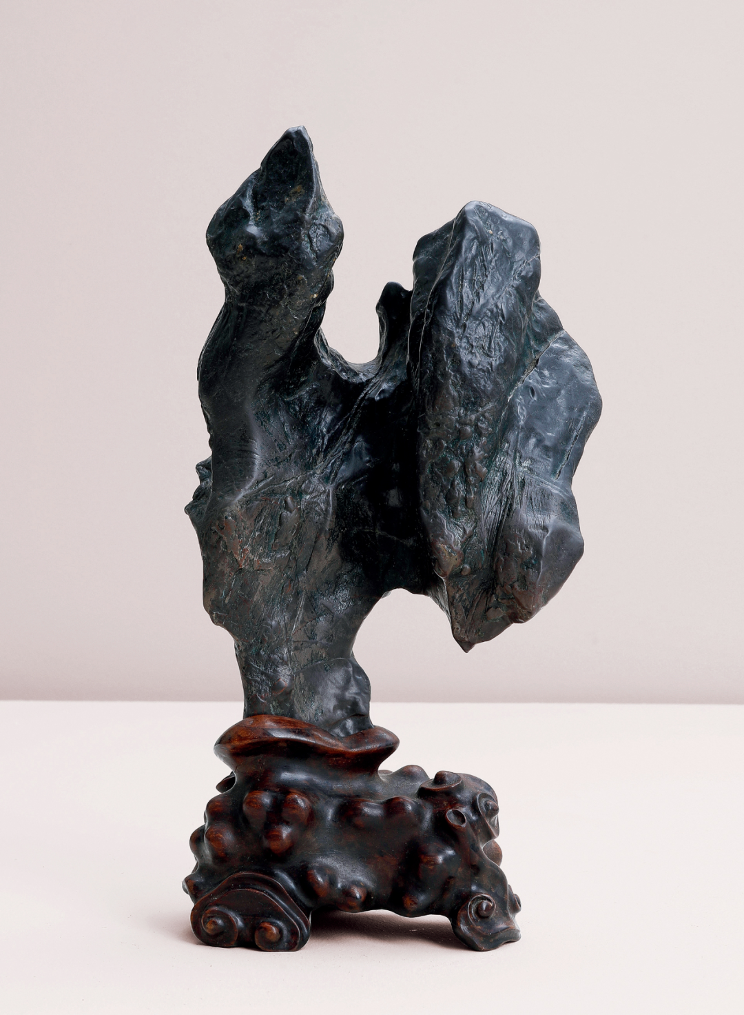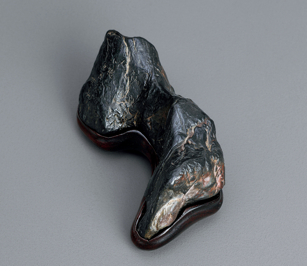 研山灵璧石质,集力与美为一体,一石兀立,中段瘦而上下巨,三折蜿蜒而上,主峰去而复留,有藏云之势,若腾龙跃渊,飞鸟挥翼般飘然。峰顶危岩突出,山势稍侧,猷似疾风骤雨之状,或如逐渐向上盘旋扭转之飓风,至峰顶则忽转急下,追寻刻意与拘谨中的自然之美。灵璧石系我国古代传统赏石之一,产于安徽灵璧县磬石山北麓,因石体造型多变,神韵天然,体表肌理褶皱丰富多变,具「瘦、漏、透、皱」之观赏之趣,为古代文人雅士所喜爱。宋代书法家米芾就因获得一灵璧石山子,如获至宝,曾以豪宅换得一尊灵璧研山,甚至逢石必拜、怀石而眠,成为我国书法史、赏石史上的一段佳话。