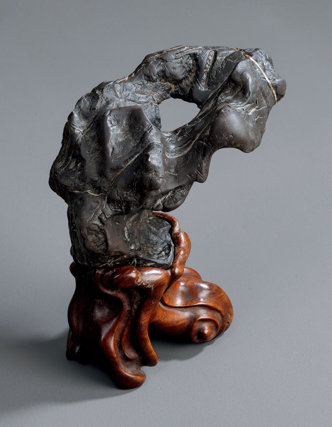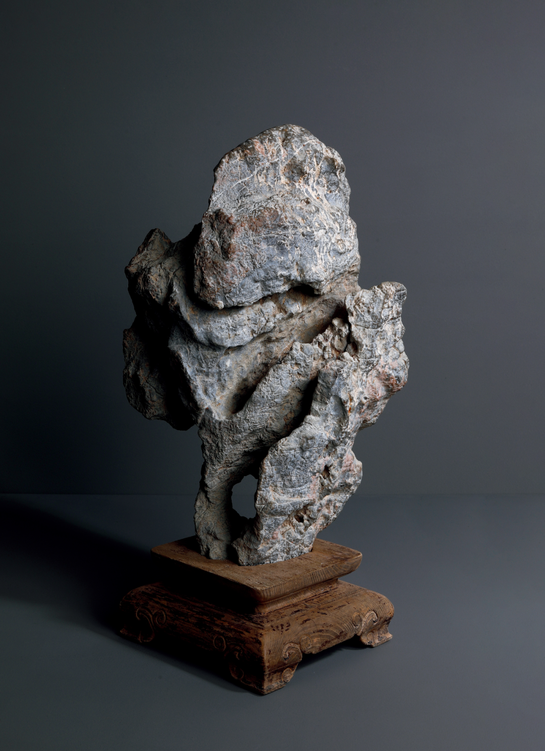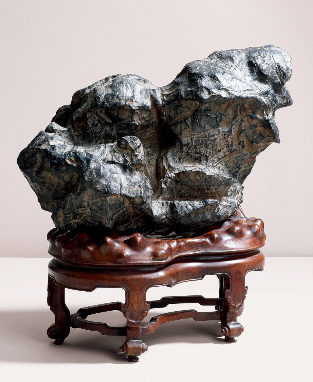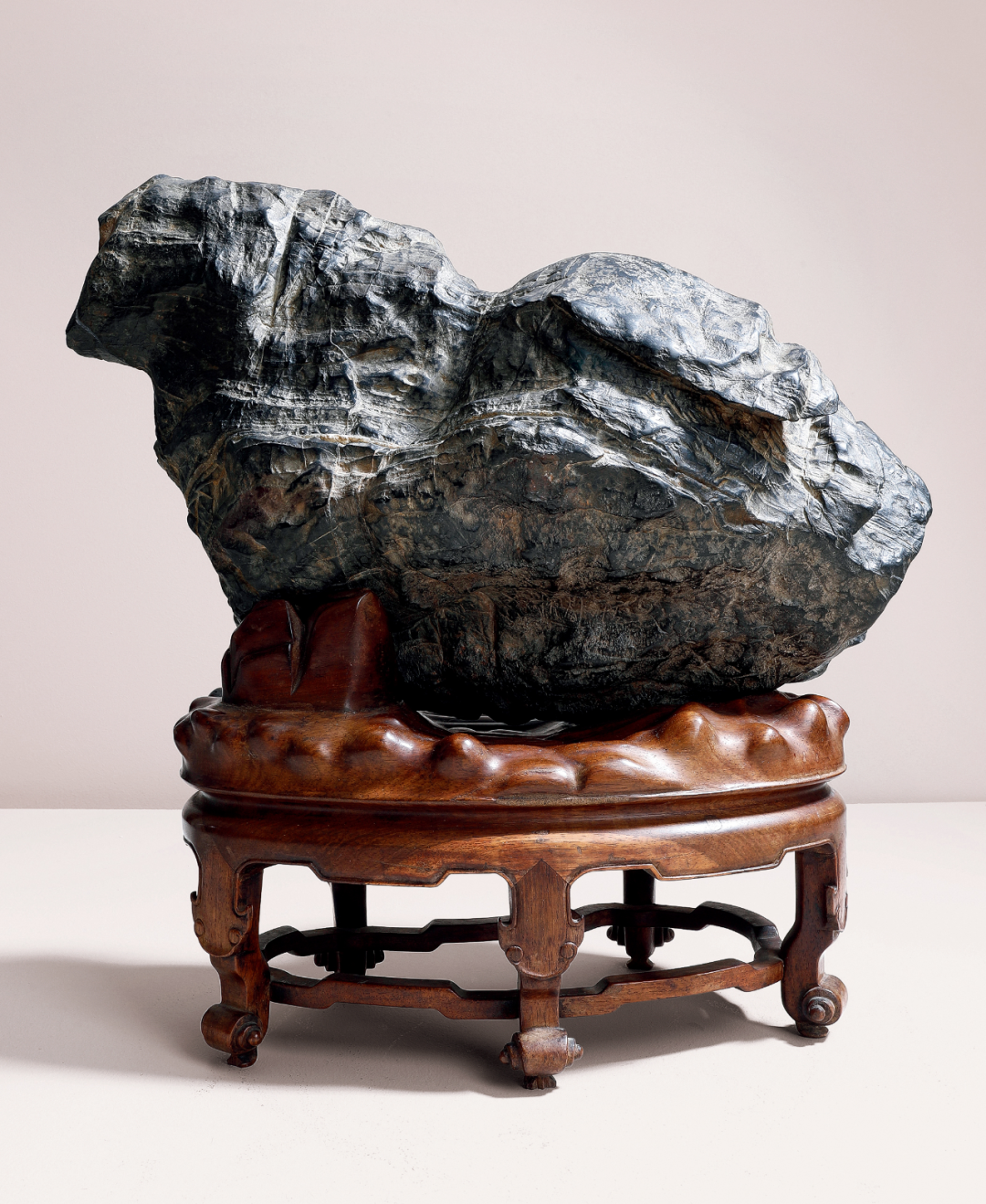 研山灵璧石质,集力与美为一体,一石兀立,中段瘦而上下巨,三折蜿蜒而上,主峰去而复留,有藏云之势,若腾龙跃渊,飞鸟挥翼般飘然。峰顶危岩突出,山势稍侧,猷似疾风骤雨之状,或如逐渐向上盘旋扭转之飓风,至峰顶则忽转急下,追寻刻意与拘谨中的自然之美。灵璧石系我国古代传统赏石之一,产于安徽灵璧县磬石山北麓,因石体造型多变,神韵天然,体表肌理褶皱丰富多变,具「瘦、漏、透、皱」之观赏之趣,为古代文人雅士所喜爱。宋代书法家米芾就因获得一灵璧石山子,如获至宝,曾以豪宅换得一尊灵璧研山,甚至逢石必拜、怀石而眠,成为我国书法史、赏石史上的一段佳话。