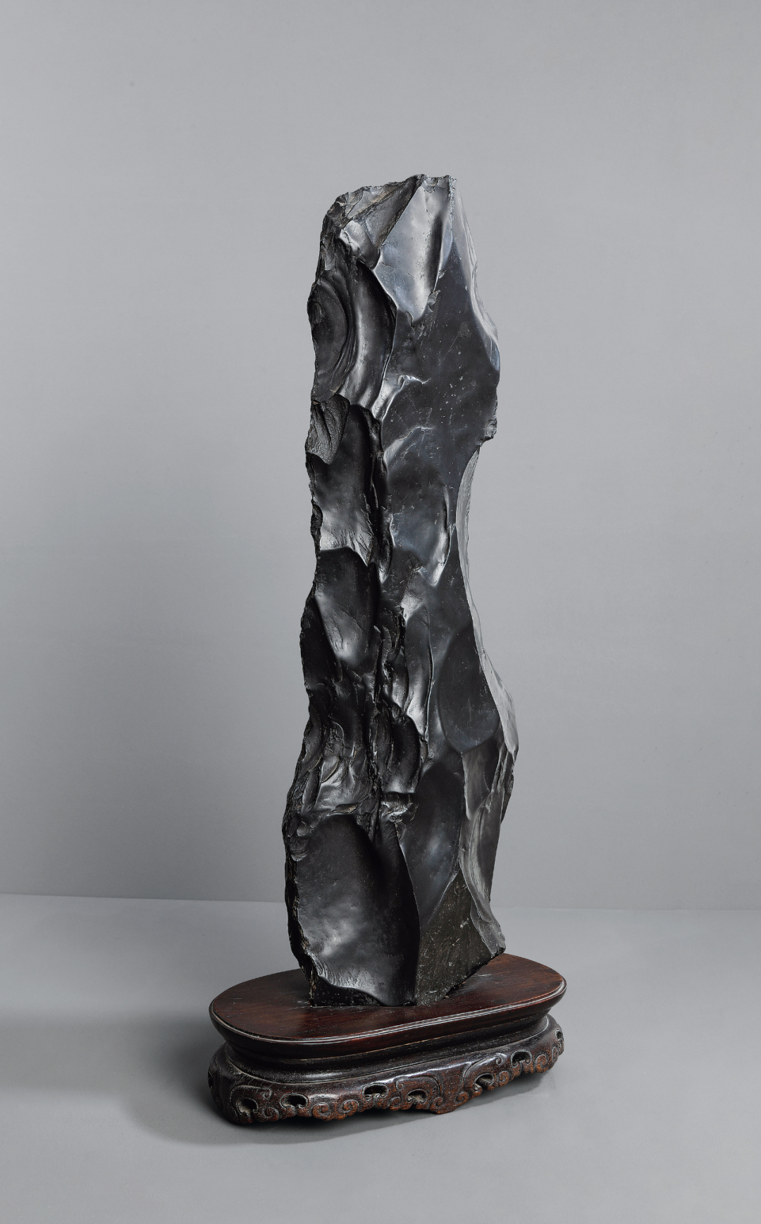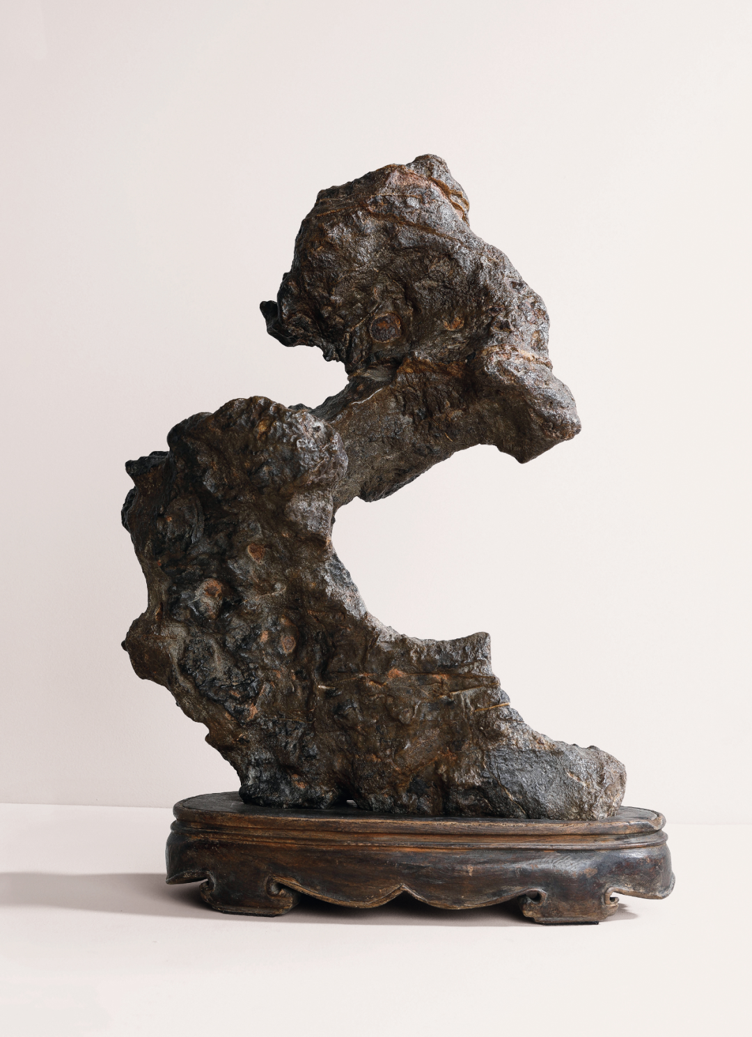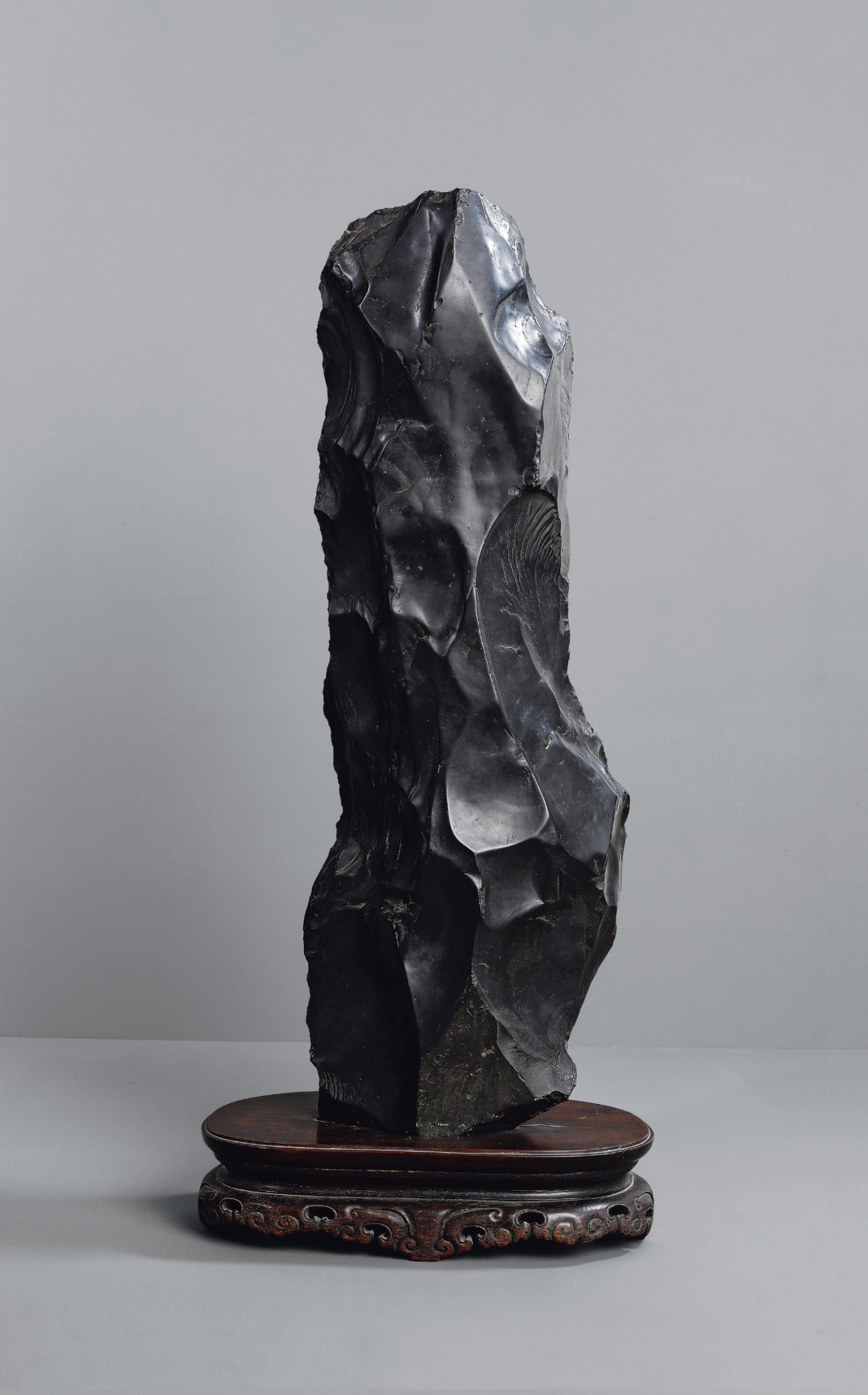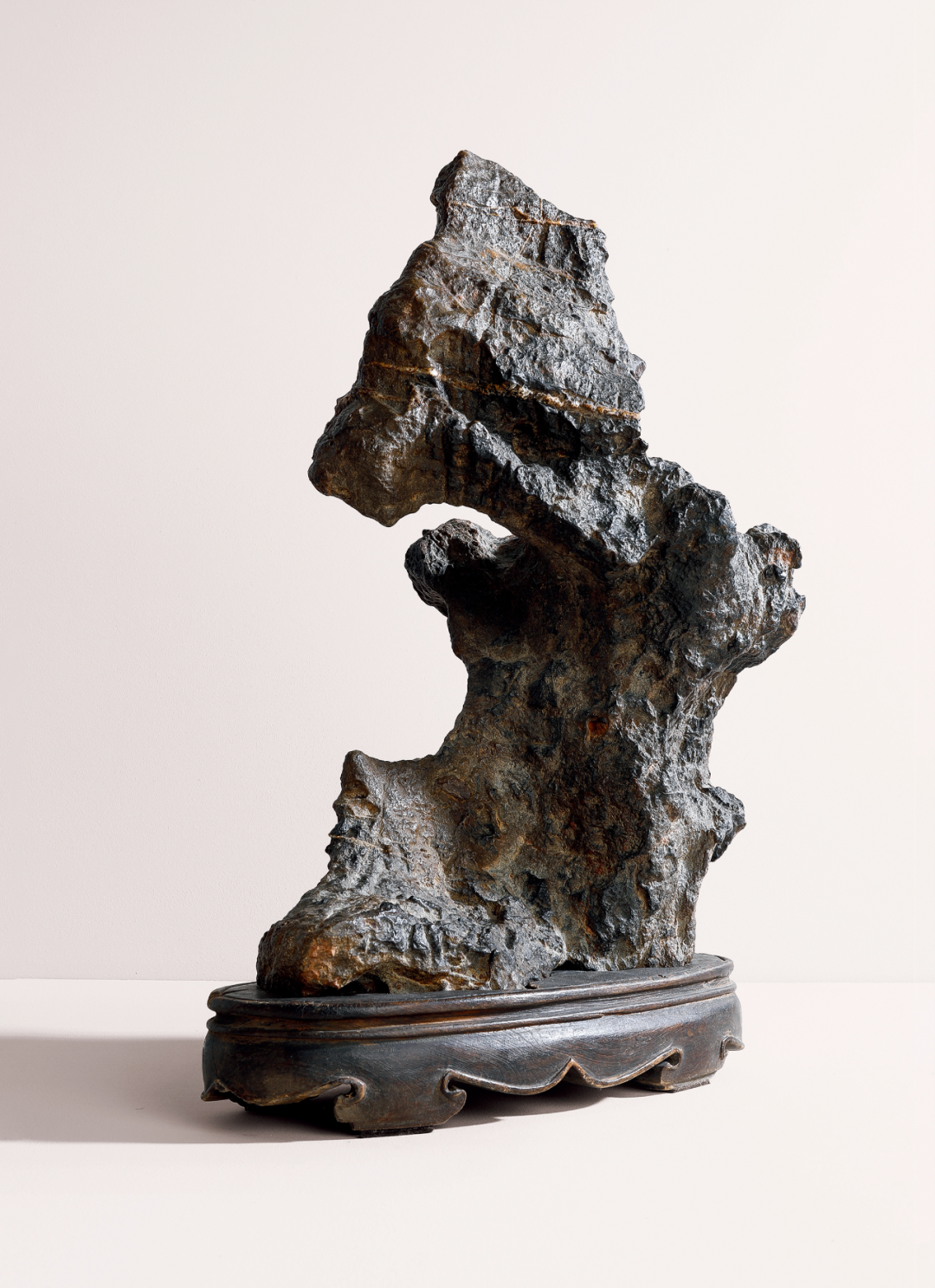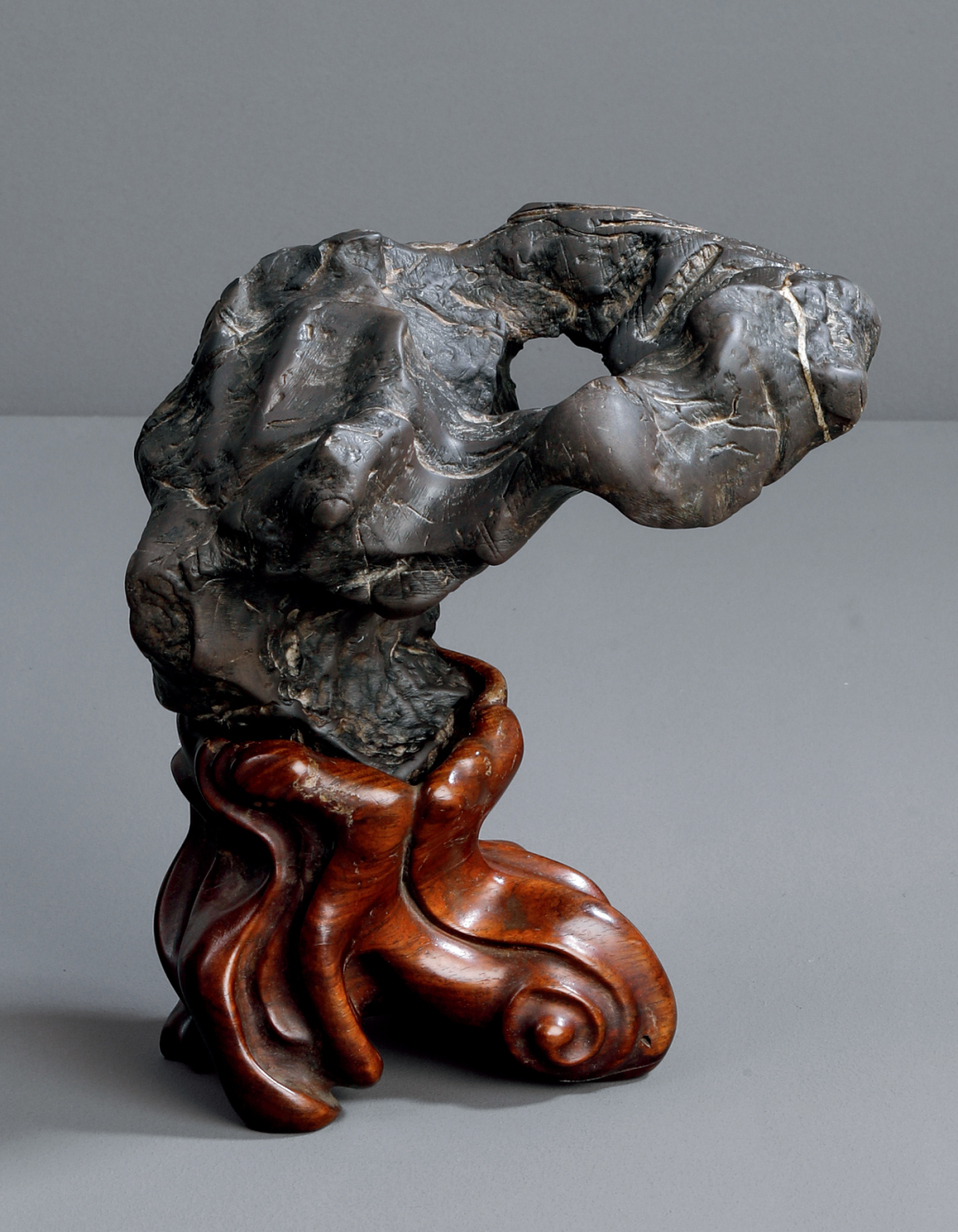研山灵璧石质,集力与美为一体,一石兀立,中段瘦而上下巨,三折蜿蜒而上,主峰去而复留,有藏云之势,若腾龙跃渊,飞鸟挥翼般飘然。峰顶危岩突出,山势稍侧,猷似疾风骤雨之状,或如逐渐向上盘旋扭转之飓风,至峰顶则忽转急下,追寻刻意与拘谨中的自然之美。灵璧石系我国古代传统赏石之一,产于安徽灵璧县磬石山北麓,因石体造型多变,神韵天然,体表肌理褶皱丰富多变,具「瘦、漏、透、皱」之观赏之趣,为古代文人雅士所喜爱。宋代书法家米芾就因获得一灵璧石山子,如获至宝,曾以豪宅换得一尊灵璧研山,甚至逢石必拜、怀石而眠,成为我国书法史、赏石史上的一段佳话。