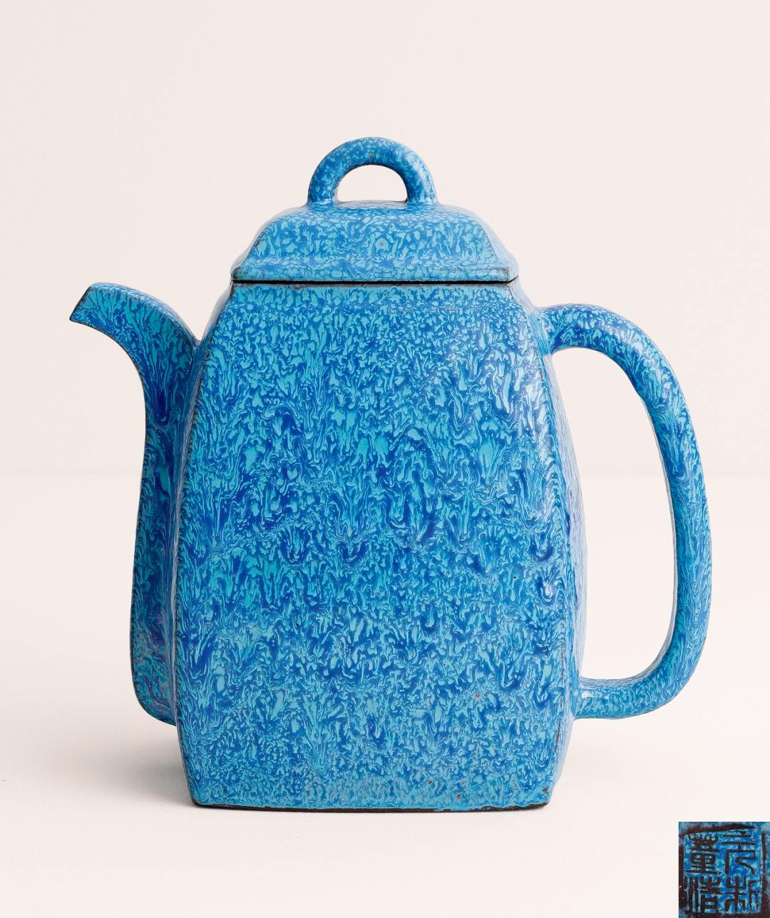 1.《故宫博物院藏文物珍品大系——紫砂器》,页251,图214,上海世纪出版股份有限公司,上海科学技术出版社,2008年1月。2.《宜兴紫砂》,页108,图41,两木出版社与文物出版社出版,1991年9月。3.《文荟菁英—和正斋宜兴紫砂藏珍》,图83,页230-231,台湾唐人工艺出版社,2012年3月1日。汉方壶是历史上传统经典壶型,其造型源自陶钫。钫是春秋时期的一种青铜制方口大腹的容器,汉方壶由此得名。这件炉钧釉汉方壶,壶身较高,壶流以四分之三平贴壶身,把圈方中寓圆,钮为拱桥式,盖口紧密吻合。器表满施炉均釉,釉彩斑斓华丽,静谧幽雅。汉方是清代典型流行壶式,此壶釉色层次丰富,流淌自然,器形纤巧,典雅清丽,做工精湛,耐人品玩。壶底印有“董清元制”款。炉钧釉属于低温铅釉,自清初就出现了华凤翔、董清元等汉方壶制作高手以及澹然斋、清远斋等著名作坊。唐英在《陶成纪事碑》中表示:“炉钧釉,色在广东窑与宜兴挂釉之间,而花纹流淌过之”。其制作方法是先将紫砂壶“本烧成品”,再施加釉料,入窑二次烧造成。董清元所作之器色彩丰富,秀丽淡雅,颇为珍贵。