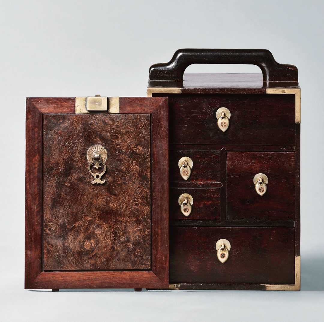 药箱通常是形容内部带有多个抽屉设计的小箱。这种箱子有时备提环便于携带,有带两扇对开门,或如此例为一片前开式门。此件拍品以紫檀木制成,局部平嵌楠木瘿,木纹团结纠缠,变化莫测。造型大致长方,箱体四角平卧法嵌纯铜包角,极为平齐,闭目触之,仿若一体。箱体上部做罗锅式提梁,两端有以平镶法做如意云头式铜活儿加固,提柄用材壮实,打磨圆钝。药箱为单开门,门面上平卧面叶及扣锁,皆为铜制。