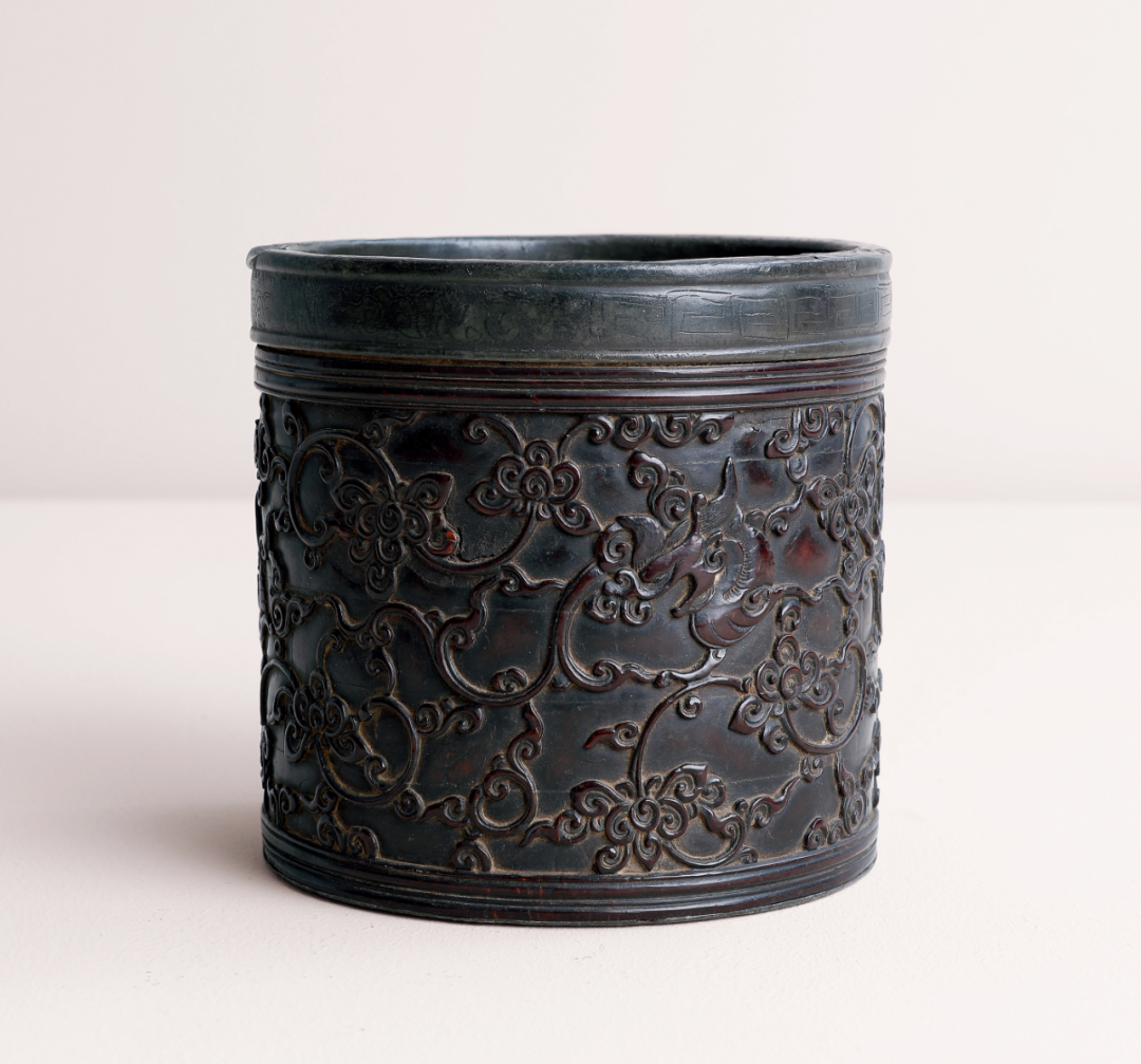 笔筒直口,平底,腹部于椰壳上浅浮雕螭龙穿花纹,形态婉转逼真,生趣盎然。枝叶纠缠盘绕,遒劲婉转,动感十足。整个画面构思布局精研巧妙,旋转观之,画面逐渐展开,气韵兼备,色如紫檀般蒸栗色,与制者精湛雕工相映成辉,彰显制者不凡心境。椰壳即椰子果去掉椰衣纤维后的外壳,质感细腻坚硬,适宜雕刻,色彩变幻,故多取之制作器物。或于内层镶嵌锡、银、铜饰,亦或镶嵌檀香木纹,皆为贡品,故有「天南贡品」之称。