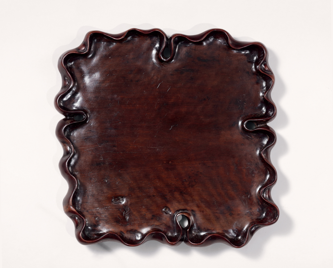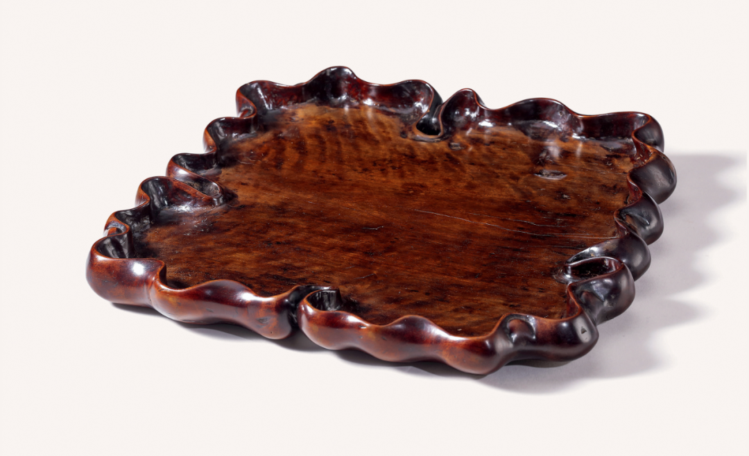1. 马科斯 弗拉克斯(Marcus Flacks)旧藏。出版:马科斯 弗拉克斯(Marcus Flacks)《笔筒特展》,纽约,2009,编号1。展览:马科斯 弗拉克斯(Marcus Flacks)《笔筒特展》,纽约,2009 年秋。托盘以龙眼木为材、纹理甚为绚丽、如虎皮之盎然。整器一木整挖、将硕大的龙眼木经搜挖打磨而成。口沿丰腴自然呈荷叶边样式,如丝带飞舞独具妙趣。此盘制作精良、刀工圆转、富有厚重的历史文化之味使人百品不厌。