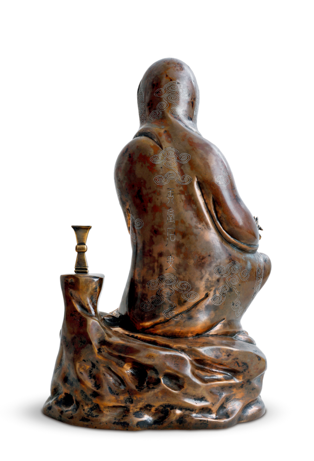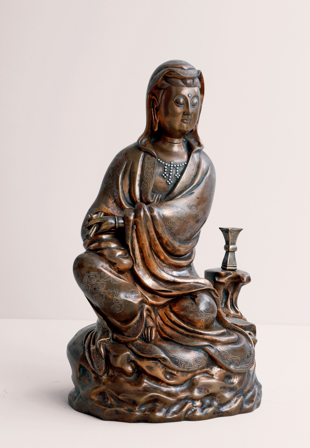 此尊观音右腿曲蹲,呈半跏式坐姿,无拘成规。观音面庞丰腴,目光下敛,神情慈祥,好似俯看尘世众生。右手置于右膝,左手重迭放置于右手上,手中执一卷文书。衣上云纹嵌银丝,富有立体感。左侧有一高台,上置一觚,构思巧妙,独具匠心。坐像后落“玉堂石叟”款。石叟是明晚期最为著名的冶炼专家和艺术雕塑大师。石叟无传艺后人,故其作品珍贵稀少。