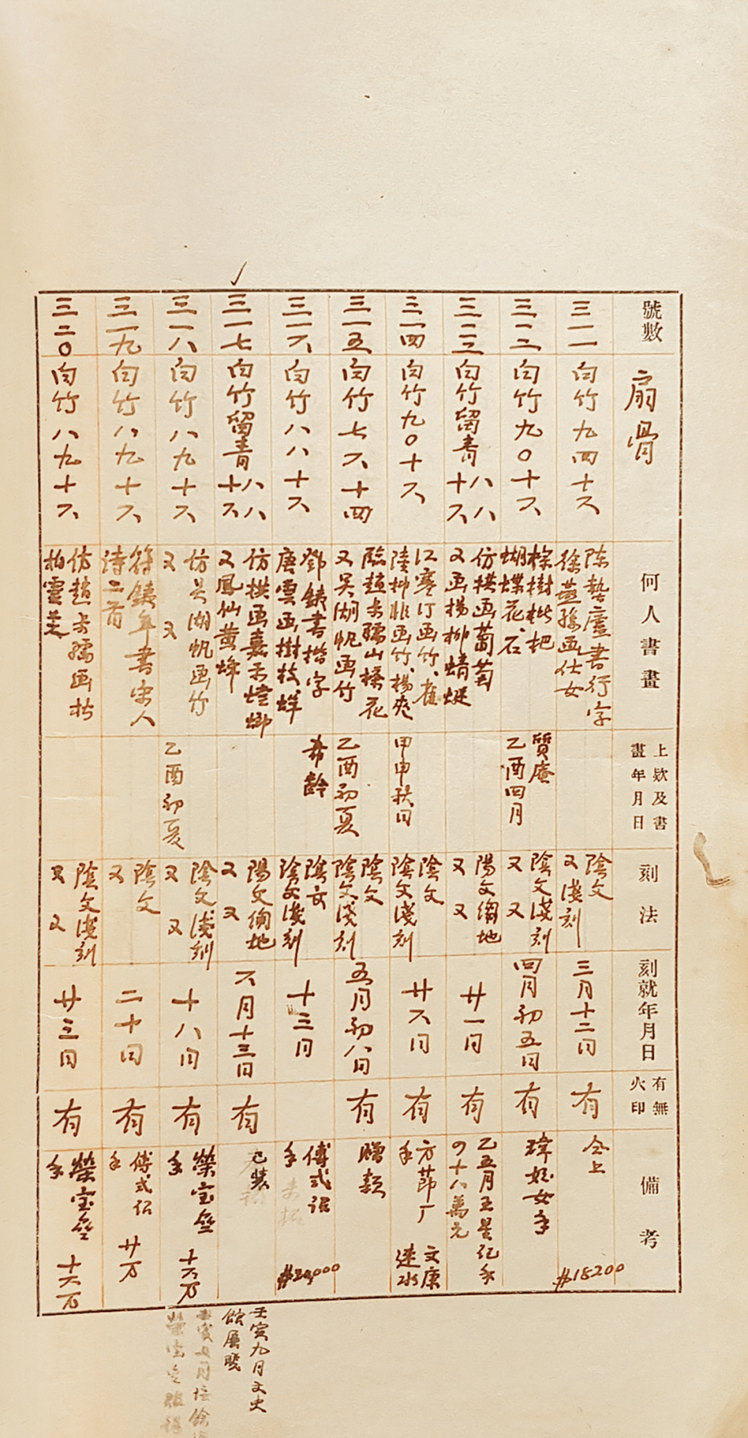 1.《金西厓竹刻目录册手稿》,第三一四号,浙江省湖州市南浔区档案馆藏品2.《刻竹小言》,金西厓着、王世襄整理,中国人民大学出版社,2003年11月,第三一四号。估价:RMB 1,000,000-1,300,000金绍坊(1890-1979),浙江南浔人,字季言,号西厓。曾学土木工程,因受家庭影响,酷爱艺术。初从长兄北楼先生学绘画,后从仲兄东溪先生学竹刻,不久即有出蓝之誉。终生专心致志,乐之不疲,成为二十世纪最杰出之竹刻家。有《可读卢刻竹拓本》、《西厓竹刻》等图册行世。1948年完成《刻竹小言》初稿,后又有所增补,为学习竹刻必读之书。江寒汀(1903-1963),名上渔,又名荻、庚元,笔名江鸿、石溪,字寒汀,号寒汀居士,画室称获舫,江苏常熟虞山镇人,近现代著名画家。陆抑非(1908-1997),名翀,字一飞,1937年后改抑非,花甲后自号非翁,古稀之年沉疴获痊,又号苏叟。江苏常熟人,杰出的画家和美术教育家。擅花鸟画。著有《非翁画语录》。
