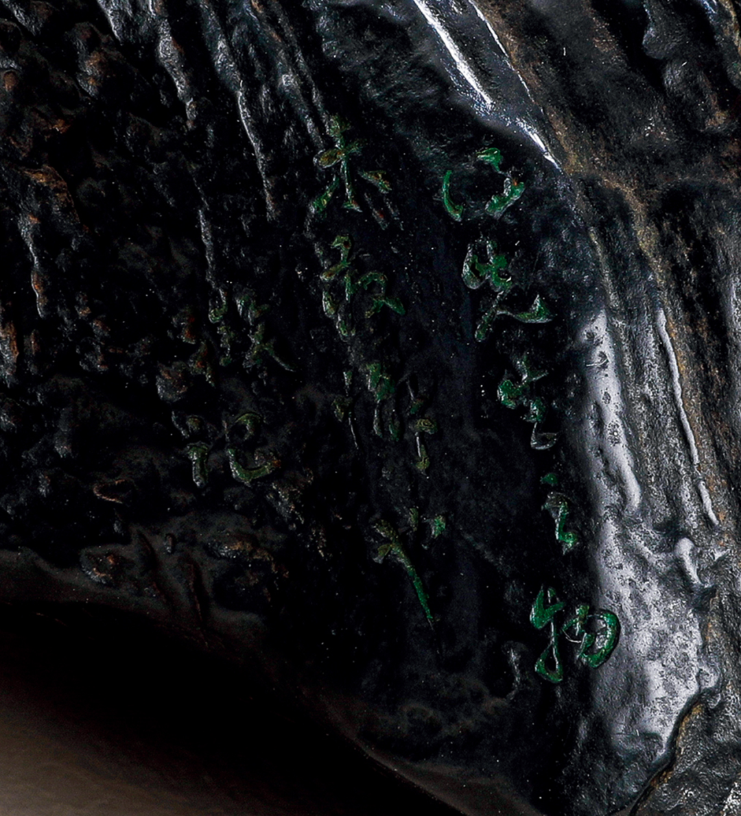 1.《案头书房内外》,中国书店出版社,2013年,页229。2.《城市山林》,西泠印社出版社,2018年,页85。研山为崂山石质地,石色青黛,如漆似墨,光润可人,宛若煤精之质。在以青绿着称的崂山石中十分鲜见。峰形高耸嵺峭,巍峨千仞,势如斧劈,石峰每面纹理皆不相同,肌理光滑如玉者、斑驳嶙峋者于一体,观之不由频生凭海临风,畅怀抒情之豪迈风度。崂山石,俗称「海底玉」,旧称「劳山石」,产于山东省青岛崂山东麓仰口湾畔,佳者多蕴藏于海滨潮间带。「蓬壶相邻,海隅清友。」其石色深沉,体生有结晶,可陈设厅堂几案欣赏。宋元时已有人将其用于案头清供及制作文房用具,明清以降始即成为名贵观赏石。姜玉君(1946-),拨云轩主人,山乳山人,1965年考入中央工艺美术学院,师从吴冠中、张仃、阿老等。拨云轩藏石必须有原配木座,且以山东地区的藏石为主,倡导苏轼「石丑而文」的美学内涵。出版有《案头》、《投壶礼赞》、《城市山林》等。鬲式炉,造型精巧,憨厚可爱,盈盈一握,颇具意趣,皮壳深沉、老辣。洒金为饰,金点斑驳,金片大小错落有致,恣意而为,色泽富贵艳丽,其口沿端庄,上方微敛而下侈,更觉饱满。颈部铸有弦纹。肩、腹圆。三兽蹄足得醇厚之美。因尺寸较小,口沿厚而腿足短小,以沉稳、凝练面貌示人。底铸「宣德」二字篆书款,字口圆润。