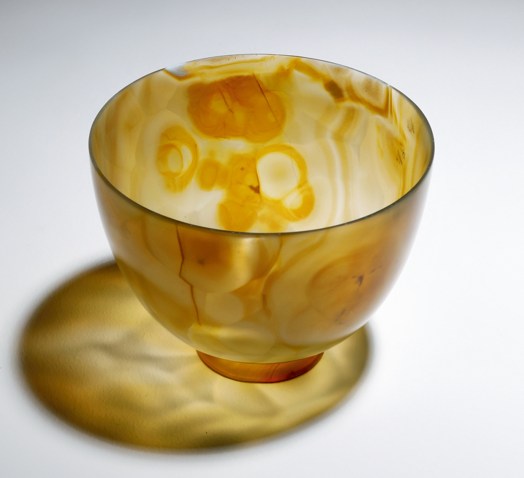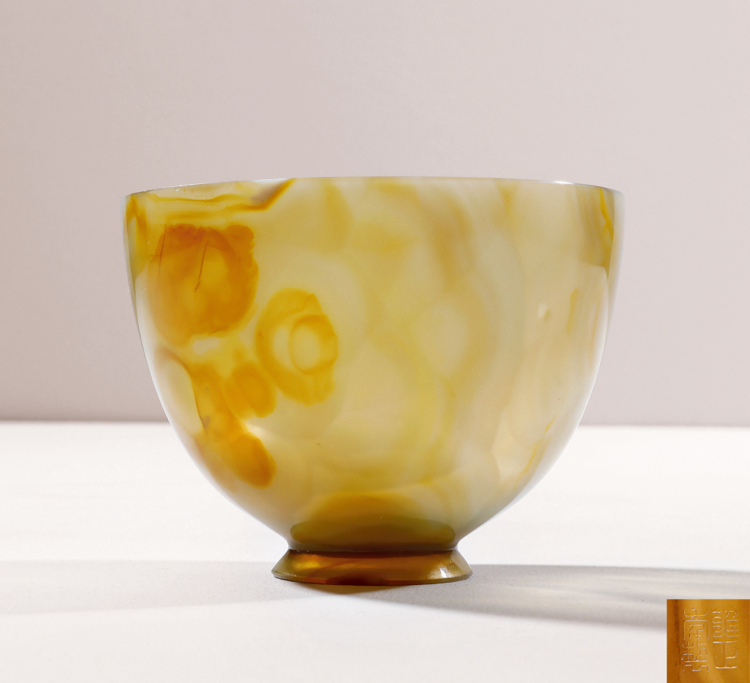 玛瑙是一种以隐晶质石英为主的具有明显纹带、花纹的矿物。数千年来,玛瑙一直是中国的传统玉石之一,乃雕琢美术工艺品的上等材料。此玛瑙碗直口、深腹、腹下斜收至底,圈足,质地致密,晶莹光洁,典雅秀丽,别致脱俗。遵循「大玉不琢,良材不雕」的原则,器身通体光素,无雕琢纹样,造型简洁明快,纹理自然交错,任大任小,忽有忽无,流光溢彩,精美瑰丽,充分展现了玛瑙色彩斑斓、晶莹剔透的特性。真水无香,珍玉不镂,恰是此器妙处。器表抛光均匀细腻,光润柔和,自然纹斑掩映其中,形制简练而韵味无穷。碗底镌刻「雍正年制」四字篆书款,字体工整雍容。此件拍品处于保税状态下,具体信息请联系北京保利拍卖中国古董珍玩部工作人员。