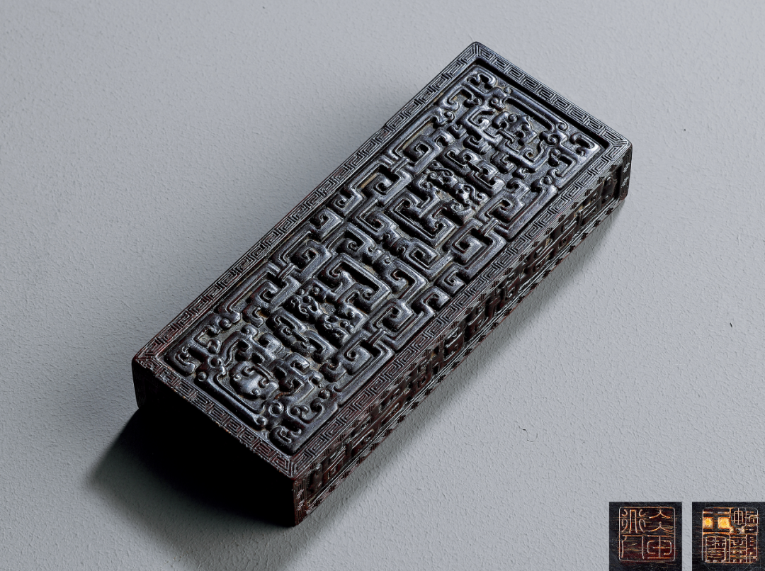 镇纸紫檀木材质,长方形,正面浮雕夔龙纹,即「拐子龙」纹,双龙首尾相对,镜像再成双,雕刻手法精湛,布局有序,华美富丽。紫檀木色紫赤,木纹清晰,木质细腻坚硬,包浆厚重,自然纯美,沉实厚重。背面光素无纹,篆刻双印章款「怡亲王宝」、「冰玉道人」。四周也浮雕变形夔龙纹,与正面纹饰呼应,整器规矩周正,置于案头欣赏甚是雅致。