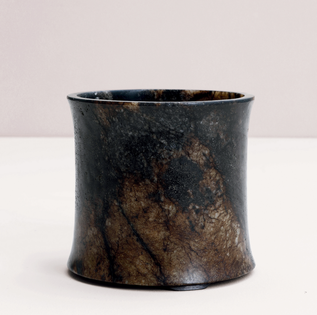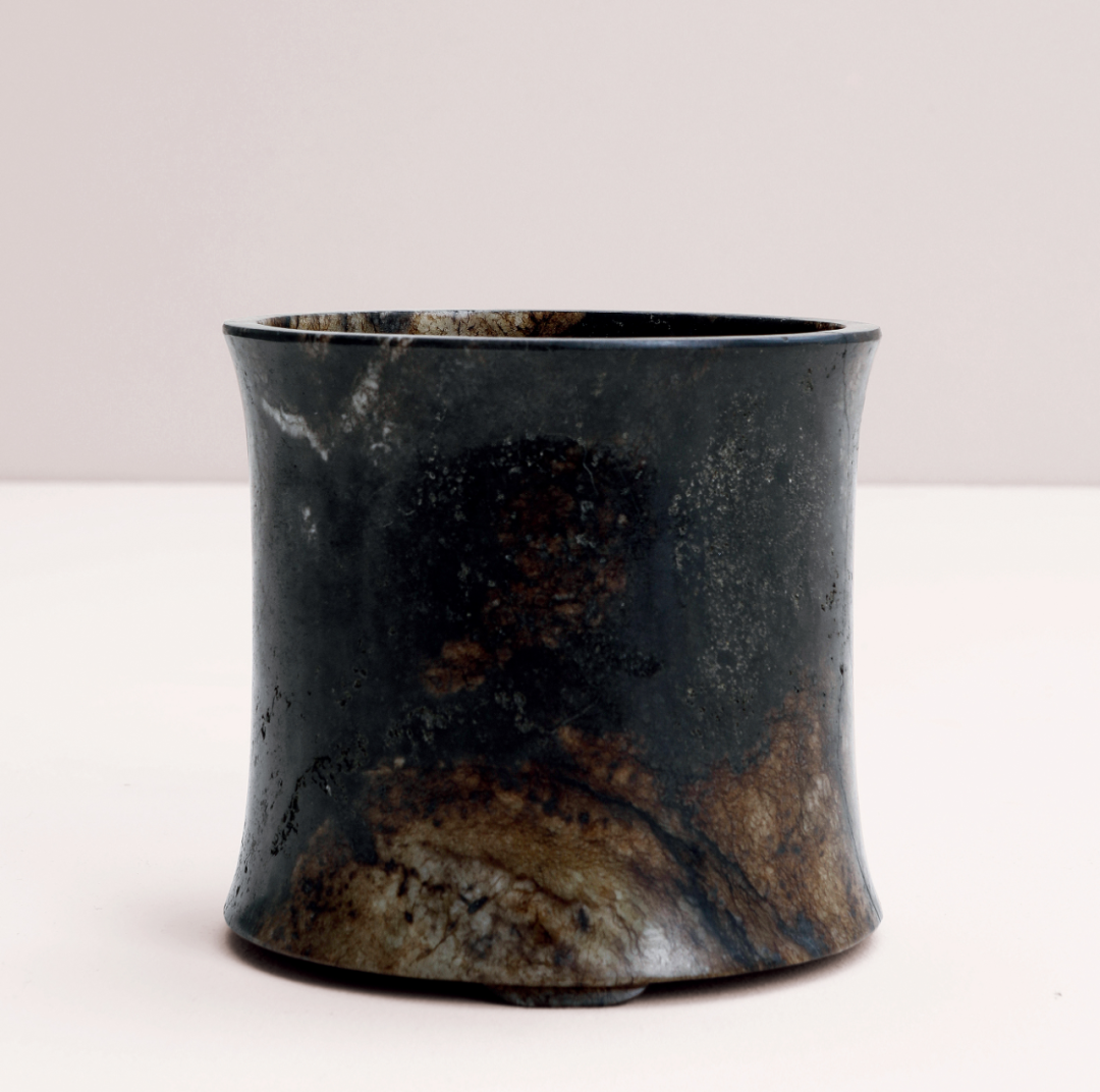 笔筒旧玉掏膛整挖,中空以纳笔。平口,肩腹微敛,足部外撇,下呈三矮足,做工细致规整。玉质古朴,沁纹曼妙丰富,如同水墨晕染的独一无二效果,玉质致密温润,荧润凝脂,包浆古朴。古文人见佳石,不肯滥为加工,以免俗工,损坏良材,此笔筒应就是此道理,故十分风雅,为上等文房佳器。此件拍品处于保税状态下,具体信息请联系北京保利拍卖中国古董珍玩部工作人员。
