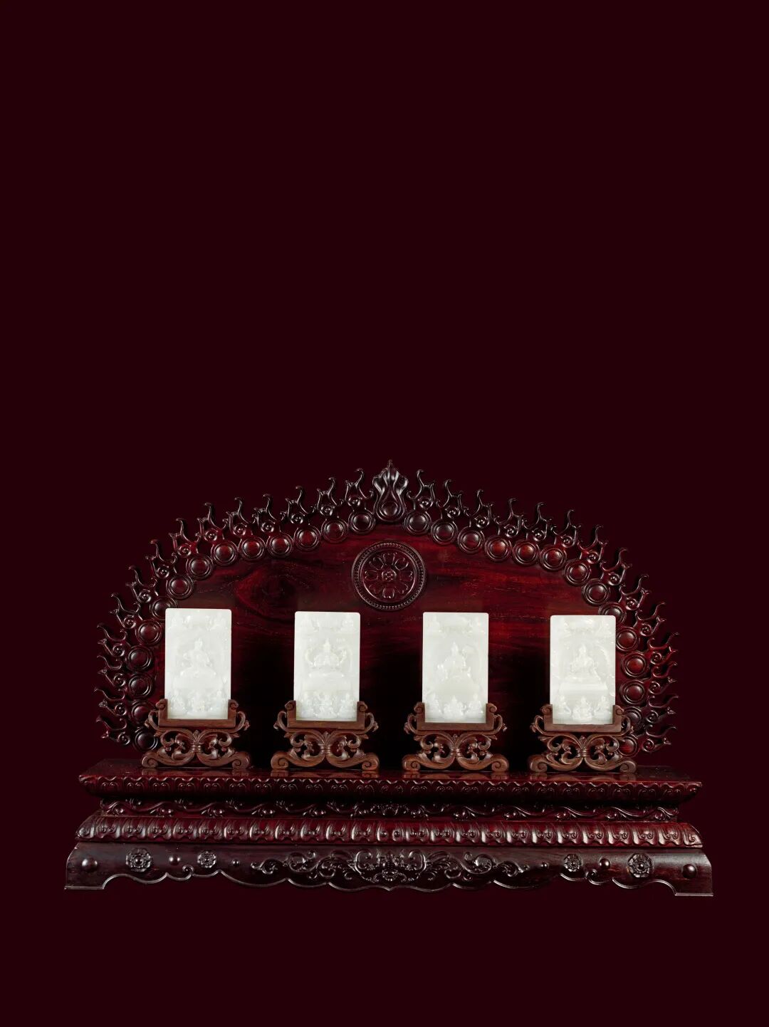 整套作品四尊菩萨法相端庄自然,各具形态,持法器,禅意十足。其细腻洁净的玉质,使作品极具立体感、生命力和画意禅境。