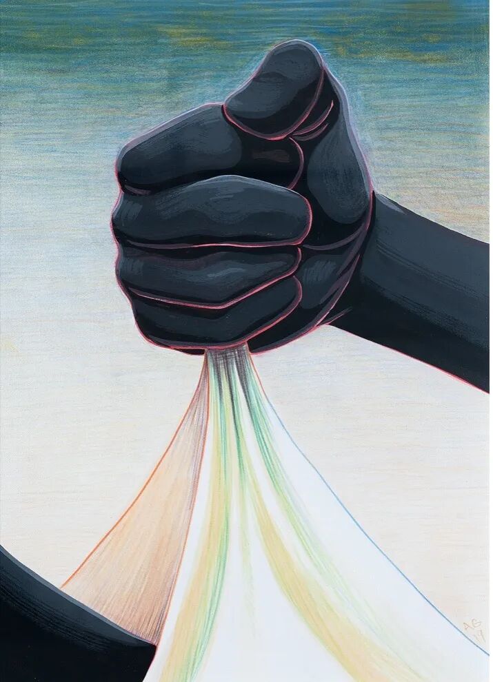 亚历克斯加德纳的作品展示了一种极简的绘画风格。他经常以冷静的笔触描绘美丽、神秘、性感的身体,画中人物通常面部省略,最明显的特征就是黝黑的皮肤,与白色布料纠缠在一起形成强烈对比。这件《胜券在握》以平静的情绪创造出一个激烈且令人难忘的场景,拳头紧紧攥住急剧折叠的光滑布料,光的反射在背景以及布料上产生深思熟虑的变化,深色皮肤与浅色棉布在画面中达到了微妙的平衡。画中人物坚实的形体、优雅的肌肉线条以及极具表现力的肤色总能让人想起十六世纪矫饰主义代表人物埃尔格列柯,亚历克斯加德纳以一种当代性的精神重新诠释了古代大师的绘画语言。
