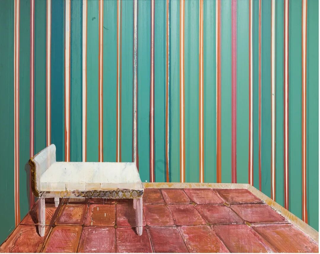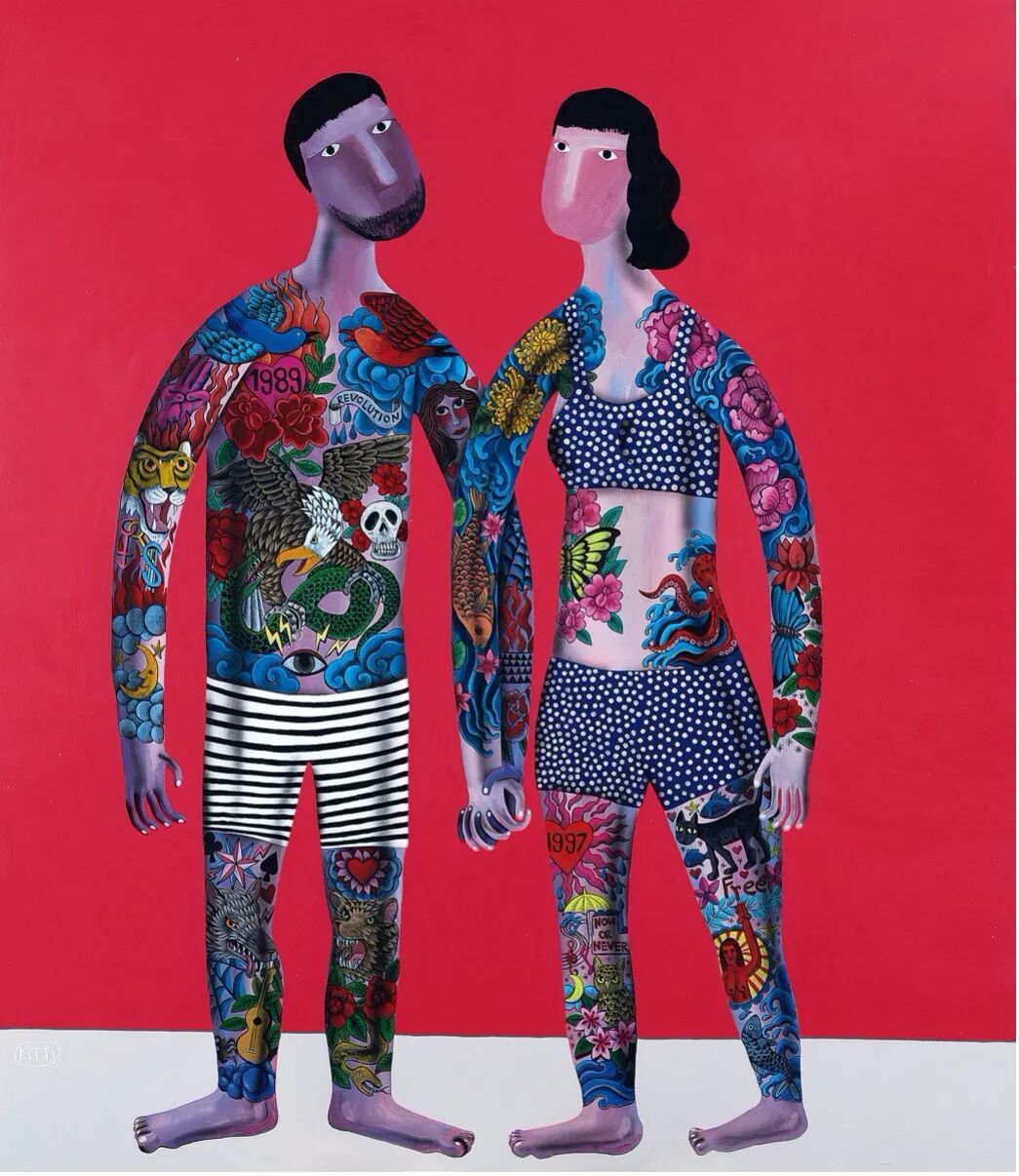 这件《王子和王妃》,用非常简洁的构图描绘了一对热恋中的男女。人物简化形体、阴影的使用都能让人联想到中世纪时期的基督教绘画,覆盖人物形体的花纹又能看出来自马蒂斯和南非艺术的影响。奇蒂纳罗德善于描绘城市青年的日常生活,并将自己思考的问题以隐秘而轻松的方式展示,通过画笔将私人记忆转化成为与观者共享的情感体验。