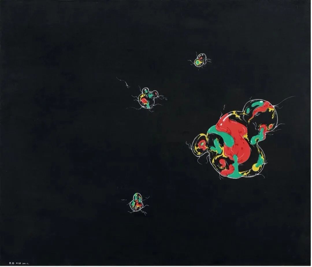 “气泡”是创下黄宇兴作品拍卖高价的经典之作,流畅的曲线组成一个个大小不同的气泡,色彩强烈而感性。创作于2018的《气泡》以一连串的荧光椭圆形闯入观众的视野,橙黄、桃红和钴蓝等跳跃度极高的色彩扑面而来,态势湍急,迸发出强势的图像力量。《气泡》生动展现了黄宇兴始终坚持将个体本质的生命体验作为其创作内核,通过运用其标志性的复杂荧光色,将无常的现实境遇、强烈的情感体验以及充满想象的世界通过交叠、虚构、再造等方式融汇于画布之上,是艺术家对个人当代体验本质的直观思考的典范。