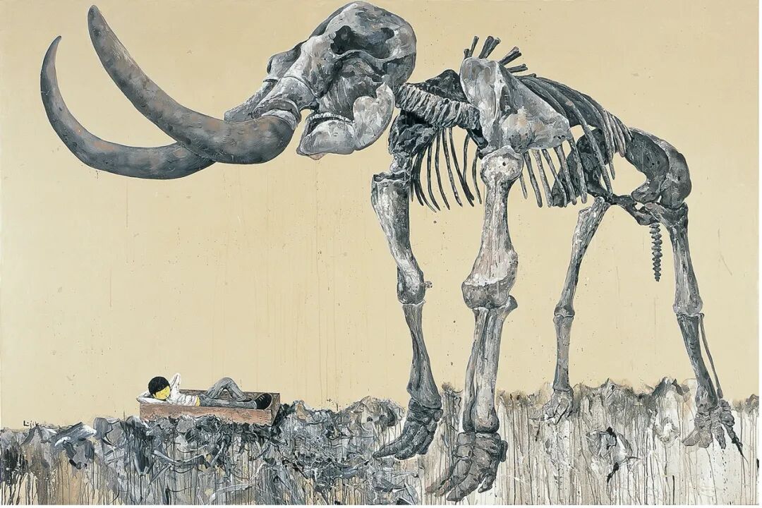 本季春拍亮相的LOT8310《大猛犸》创作于2017年,是李继开创作最为丰硕的时期,他的个人风格已日趋完美,对图像背后的自我剖析更为深邃、更为内化。大猛犸是早已灭绝的远古生物,可它的巨大遗骸却屹然伫立于和人共存的场景,带着厚重的历史尘埃,占据画面的视觉焦点,震撼人心,格外地苍凉和有意味。他结合当代的视觉经验,突出日常图像作为符号的叙事性,强化“绘画性”的图像表达,并且能打破图像复制的藩篱,将图像与自我的主体意识与“冥想者”的气质有机的结合起来。