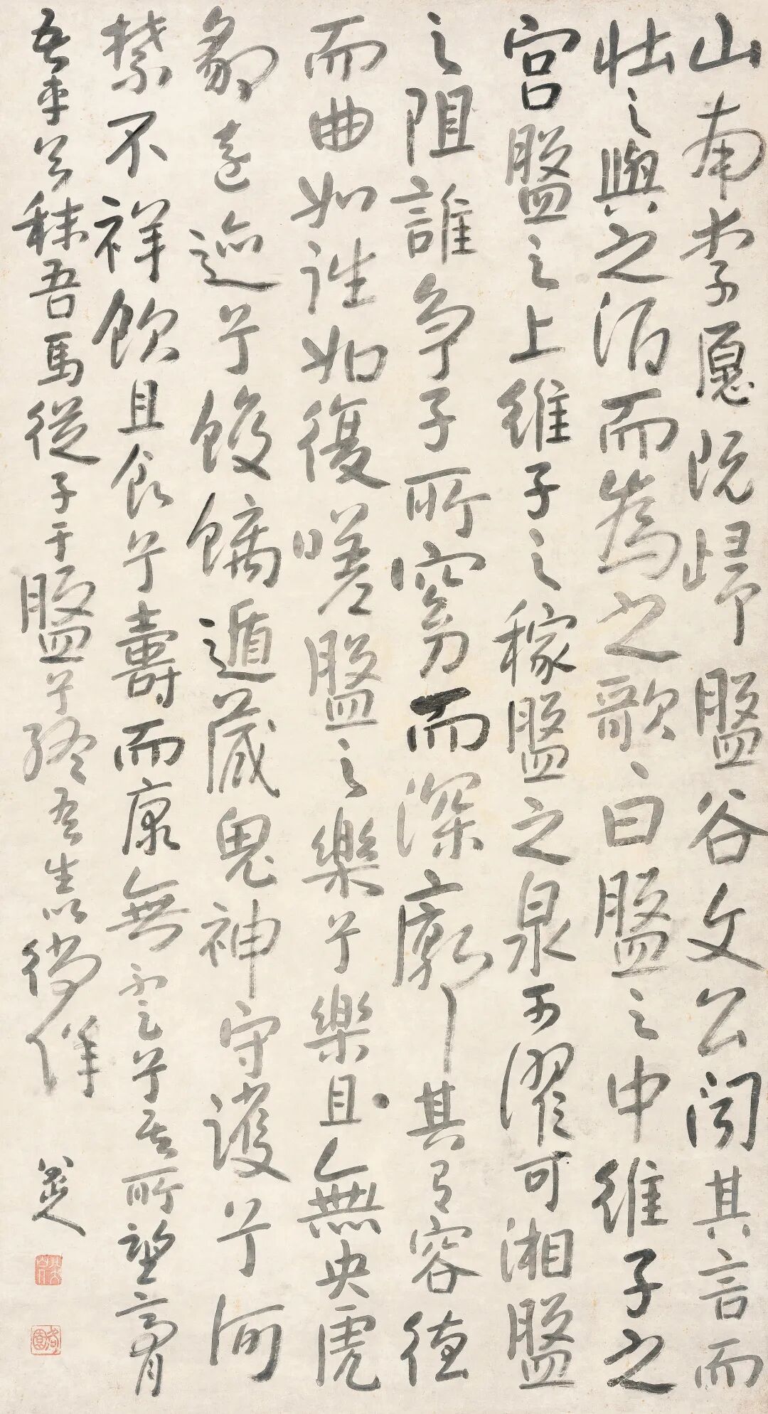 八大书法初学董其昌,后学黄山谷、钟太傅。善楷、行,复兼篆书。故其晚作每以篆籀之笔入行书,复参之画意,故圆厚敦朴,绝去姿媚,品格极高。好用淡墨,更兼疏密参差的分行布白,犹如一淡墨抽象的画作,以静静的淳古之态,全新的面目吸引着你。《送李愿归盤谷序》从书风及款字看,已是其七十后的晚岁之笔,幅式极大而神气自若,字体雄伟,是他风格典型开门见山的佳作。