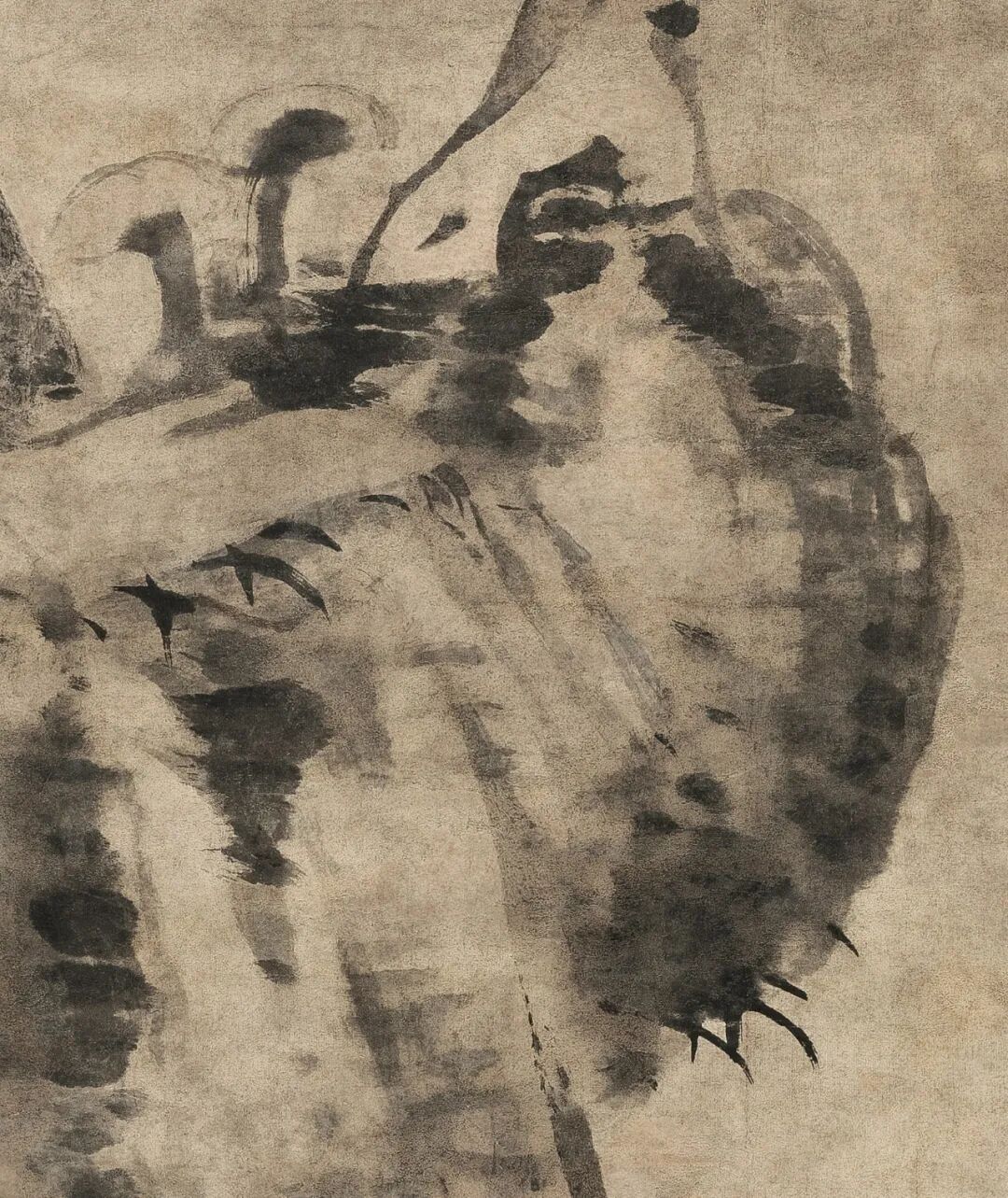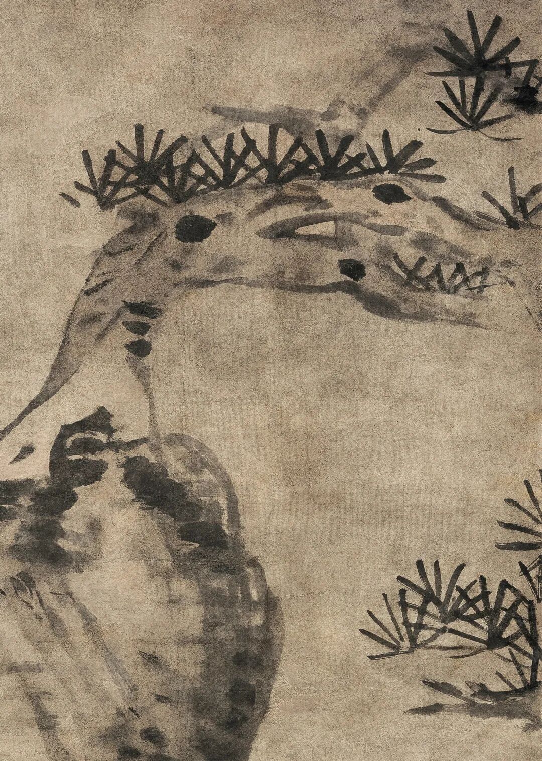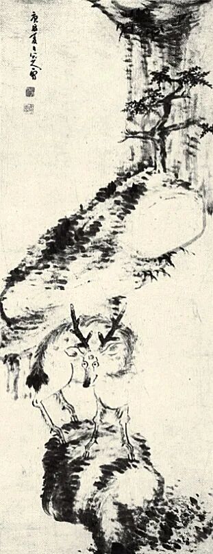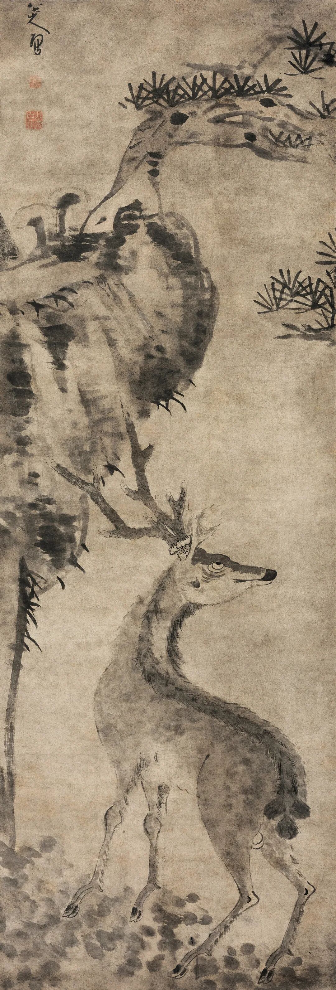 糜鹿点染数笔,神情毕具,扭头回望姿态,与坡势向右倾斜伸展、老松自画面外延构成回环之势,视觉带回主导的鹿向上翻转的眼睛,呈现出八大画作特有的高洁之气,幽绝冷逸。而鹿的身体形态与弯曲树干呼应,谐和统一,超出凡境。