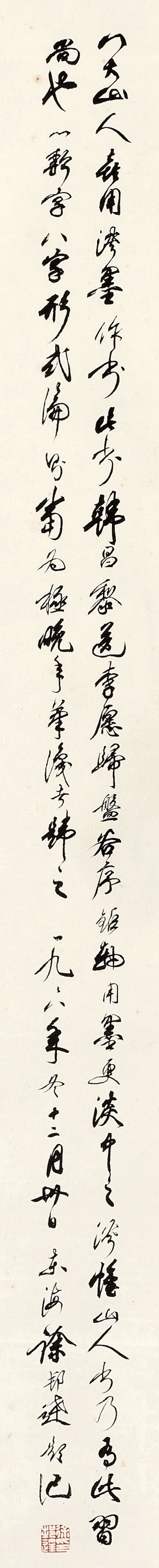 徐邦达边题:八大山人喜用淡墨作书。此书韩昌黎《送李愿归盘谷序》巨轴,用墨更淡中之淡。惟山人书乃有此习尚也。以款字“八”字形式论,则当为极晚年笔,识者韪之。一九九八年冬十二月卅日,东海徐邦达题记。