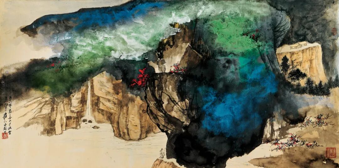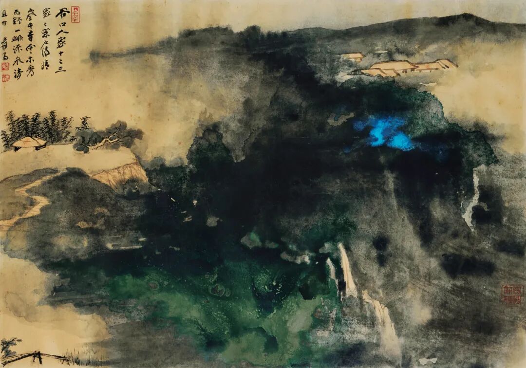 估价:RMB 20,000,000-26,000,0001.《张大千在台湾》第 72-73 页,台北故宫博物院,1983 年。2.《艺术新闻第135 期—二十世纪中国艺术名家专辑 7-张大千》第 68 页,2009 年。1.香港佳士得 1997 年秋季拍卖会 LOT148, 成交价:HKD 2,220,000,为佳士得当年书画专场最高价。2.香港佳士得 2017 年秋季拍卖会 LOT1406,成交价:HKD 41,725,000。3.本幅泼彩所用画纸为张大千在日本特别定制,系仿宋代罗纹纸而成,纸张坚结而平滑。虽薄却颇耐擦磨,青绿重彩施于其上,附于表面而不沉入纸内,特别显出色彩的华丽。【注】此件作品的交接地点为中国香港,具体信息请联系北京保利拍卖中国书画部工作人员。