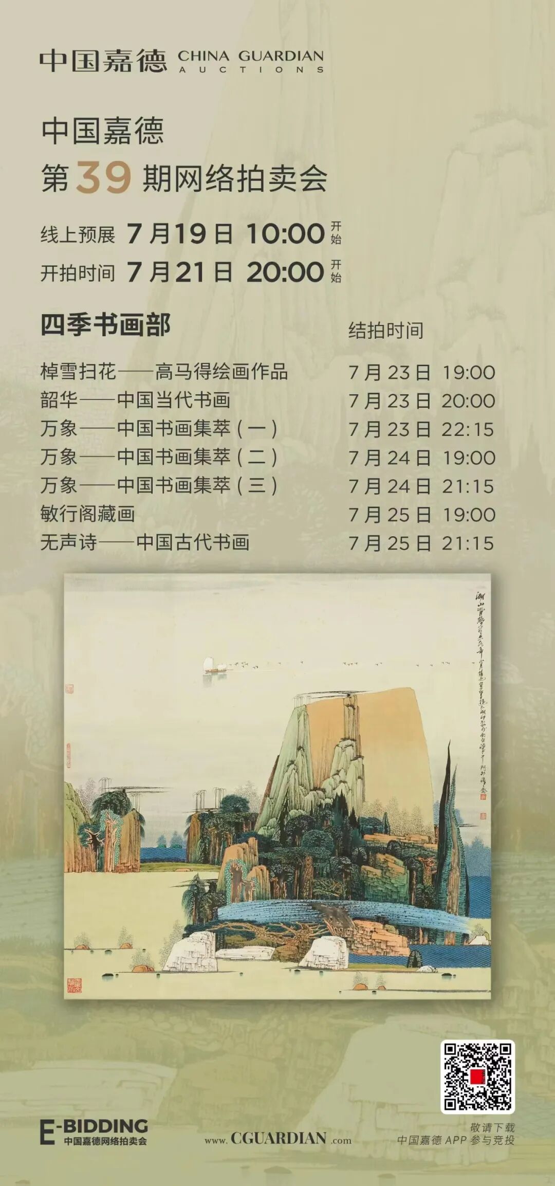 E-BIDDING中国嘉德第39期网络拍卖会于7月19日上线,中国书画部分精选400多件多姿多彩的书画精品,共呈现7个专场。其中,再度推出的|“棹雪扫花—高马得绘画作品”专场共有20多件精品上拍,均带有高马得后人签名证书,来源清晰,佳作难得。“韶华——中国当代书画”、“万象——中国书画集萃(一)、(二)、(三)”、“|敏行阁藏画”、“无声诗——中国古代书画”等专场均是名家荟萃,缤纷夺目。无论是老藏家,还是新朋友,均能找到属于你的那个清凉境界。