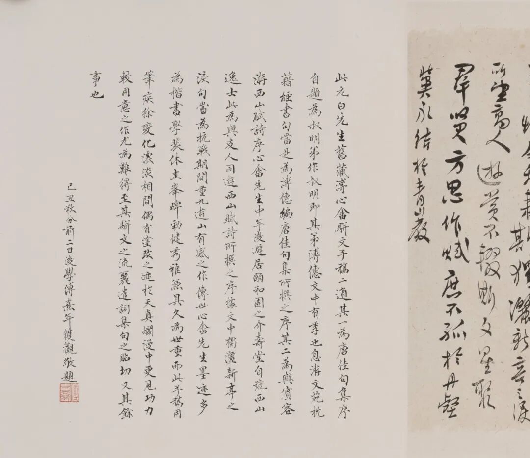 说明:是件傅熹年题跋。溥儒先生与启功先生之交,大概为一九三二年,启功先生二十岁左右,在敬懿太妃的事上遇到王孙。一九五九年,启功先生在市肆见王孙草书五言诗卷,卷书于一九三三年癸酉,正启功先生晨夕登寒玉堂执艺请益之时,为王孙精力弥满时得意之笔,罄囊购得;一九七八年一月十七日启功先生将诗卷捐赠辽宁省博物馆。启功先生二十世纪八十年代作《溥心畬先生事略》,一九九三年三月作《敬记溥心畬先生》(后名为《溥心畬先生南渡前的艺术生涯》)二文。此《唐佳句集序》《与宾客游西山赋诗序》卷当为一九三九年至一九四六年之间所作;一九三九年,心畬先生因向辅仁大学租用萃锦园期限已满,又为免受日人之骚扰,与正室罗清媛迁居颐和园,租用介寿堂,时多用荣宝斋木版水印纸作楷书联;至一九四六年,张大千先生亦来颐和园,住养云轩,与王孙多有合作;骈文当在此七年之间所书。