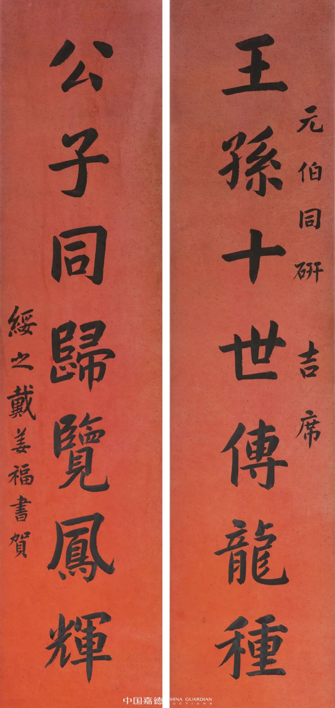 说明:戴姜福先生,依一九三六年启功《吴县戴绥之先生事略》所记,生于同治庚午年(一八七〇年)十月十六日(一说同治壬申年十月十六日),卒于民国二十五年(一九三六年)丙子夏正十月十六日,长启功先生四十二岁。先生字向五,号绥之,别署山枝。一九二八年,启功先生升入汇文中学商科之后,经世交介绍跟随戴姜福先生学习古文。戴老师早岁由启功曾祖溥良先生选为拔贡入京考试,在李慈铭(越缦)门下考中举人,时戴老师在礼士胡同曹君直家教家馆,君直先生亦为溥良先生做江苏学政时门生,跟启功祖父毓隆先生交谊深厚,情如兄弟,可以说俱念知遇之恩,对启功先生偏爱有加。启功先生利用课余时间下午四点到曹家学古文,戴老师留下再单独教授。戴老师因材施教,打下深厚古文功底,让启功先生终身受用。此为一九三二年启功与章宝琛结婚所赠喜联,上款用“元伯同研”,是谦词。