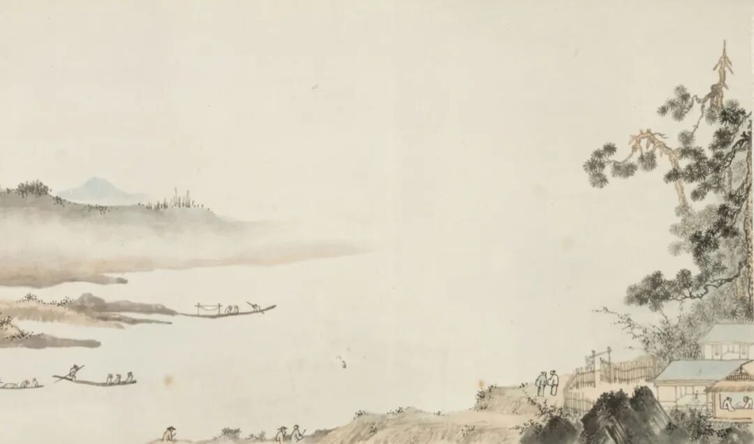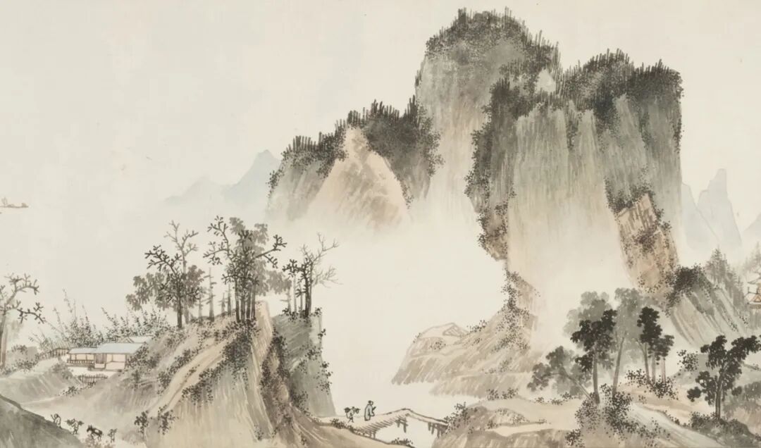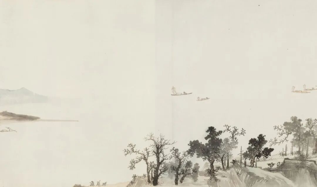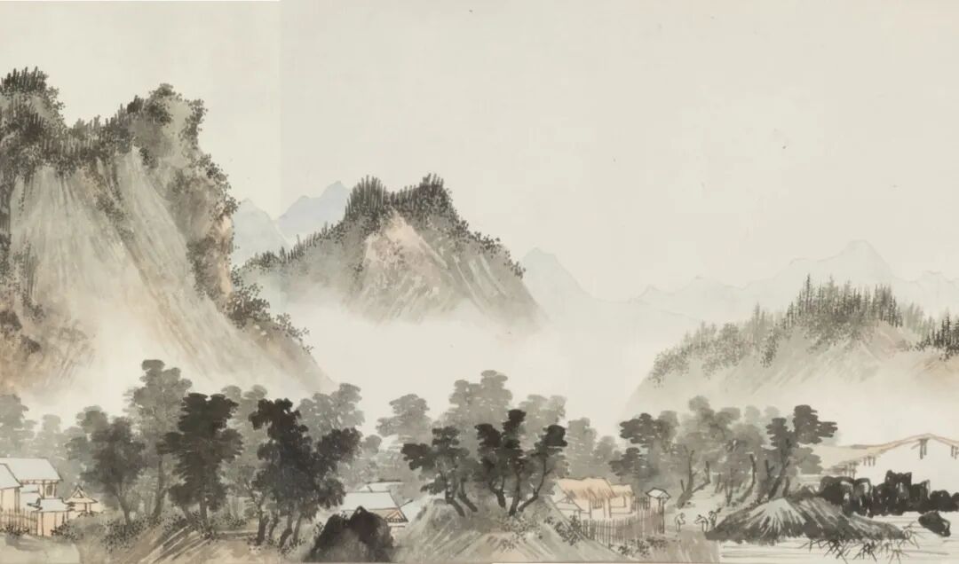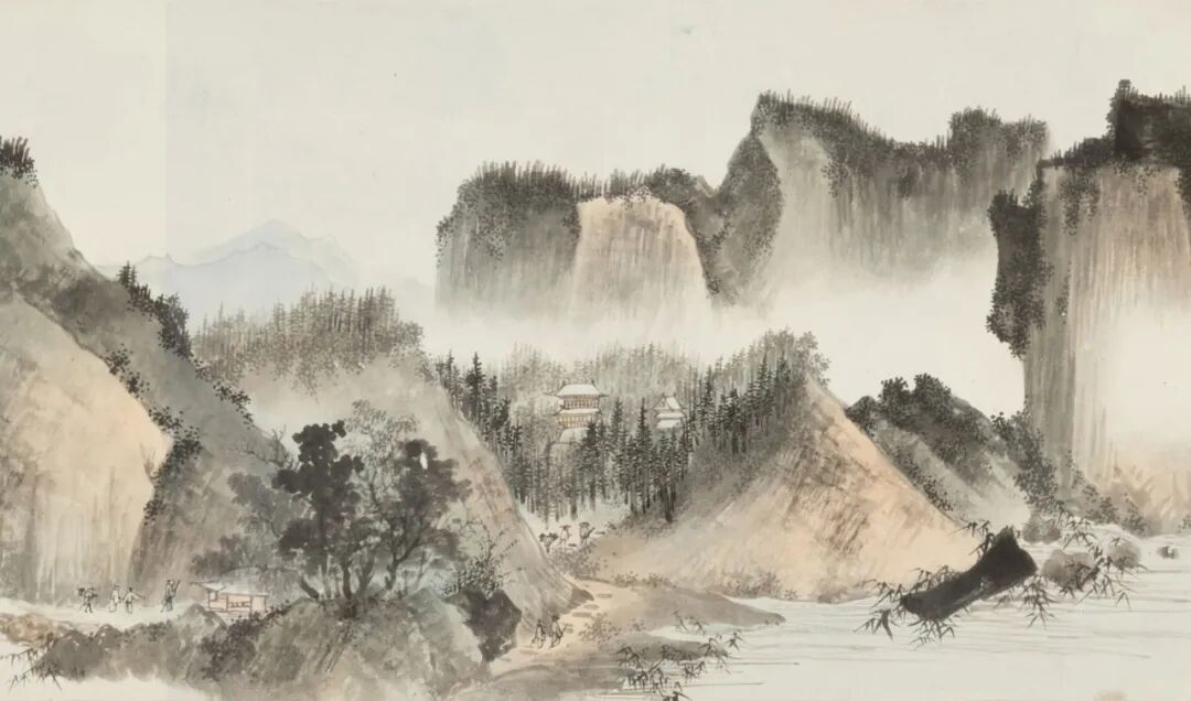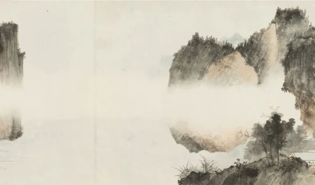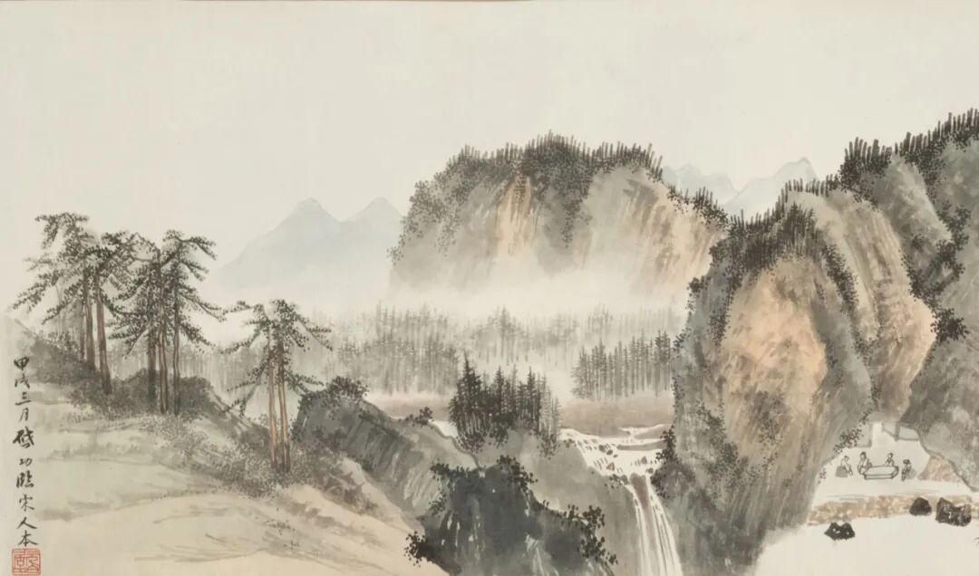说明:元孙君泽四季山水,今存夏、秋二景,此临为秋景,今藏日本东京静嘉堂文库美术馆,见溥儒先生有多件临本传世。原作横五九厘米,纵一四二厘米;心畬先生临本有横三六厘米,纵八八厘米;与启功先生临本基本皆为等比缩小所临。启功先生此作,用太岁纪年,为一十九岁(实岁)所绘。这时先生在汇文中学商科读书,据先生回忆“我在二十岁左右,渐渐露些头角。一次在敬懿太妃的丧事上遇到心畬先生,蒙得欣然奖誉,令我有时间到园中去”,知此作即拜见王孙前后所绘。