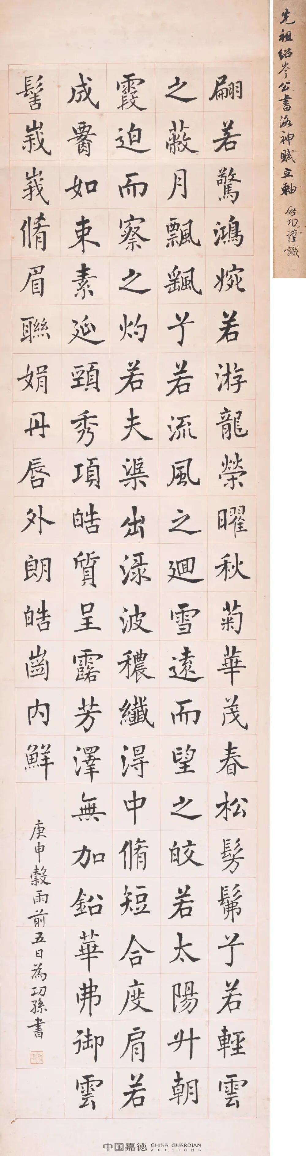 题签:先祖绍岑公书洛神赋立轴。启功谨识。