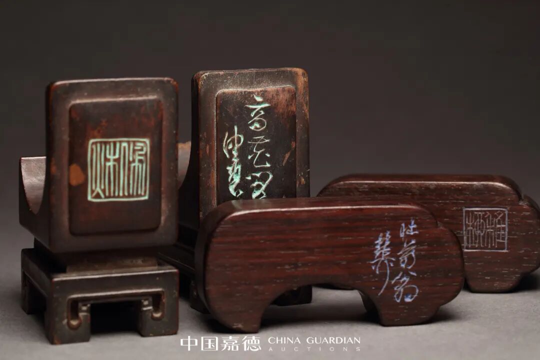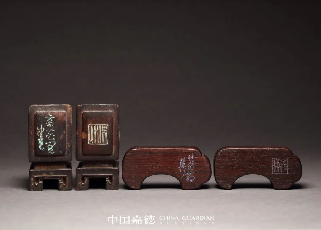 木制画轴托,四只两对,木质细腻,色泽沉郁,两对皆一只刻行书字号,另一只刻篆书印款。刻铭“壮暮翁”者为平卧式,红木制,一侧如意云首,中部半圆下凹,承托画轴之首,线条婉转洗练,刻铭内填靛蓝色颜料;刻铭“高华阁”者,楠木制,有束腰,四足内卷,形制考究,新月形承轴槽,侧壁刻铭,内填青绿色颜料。