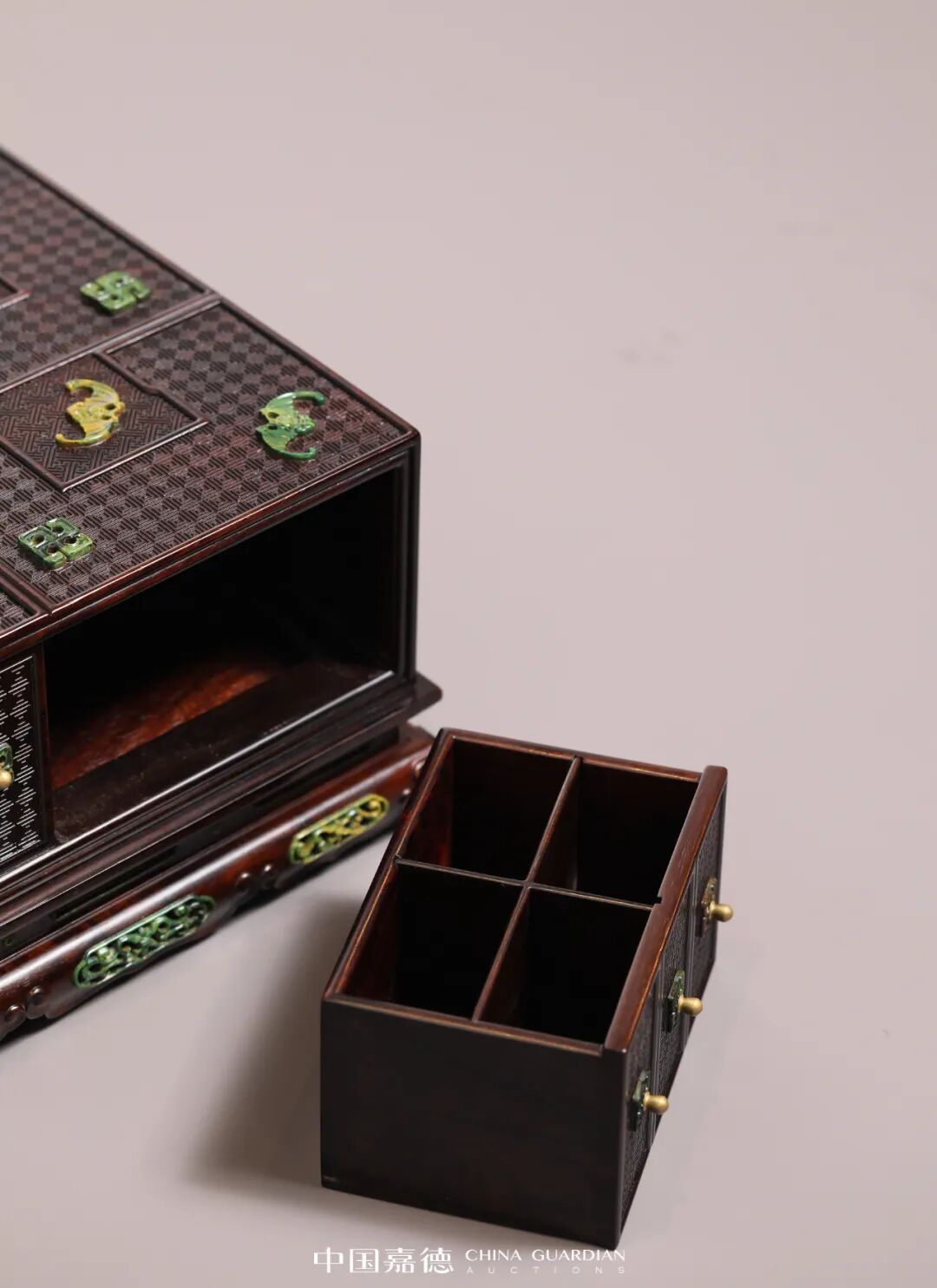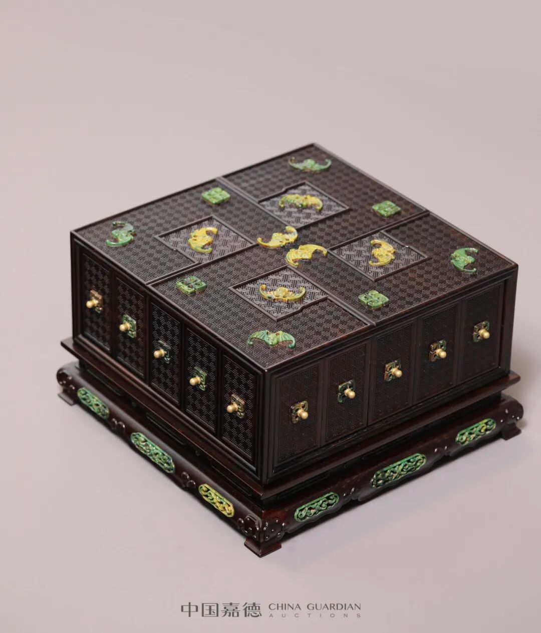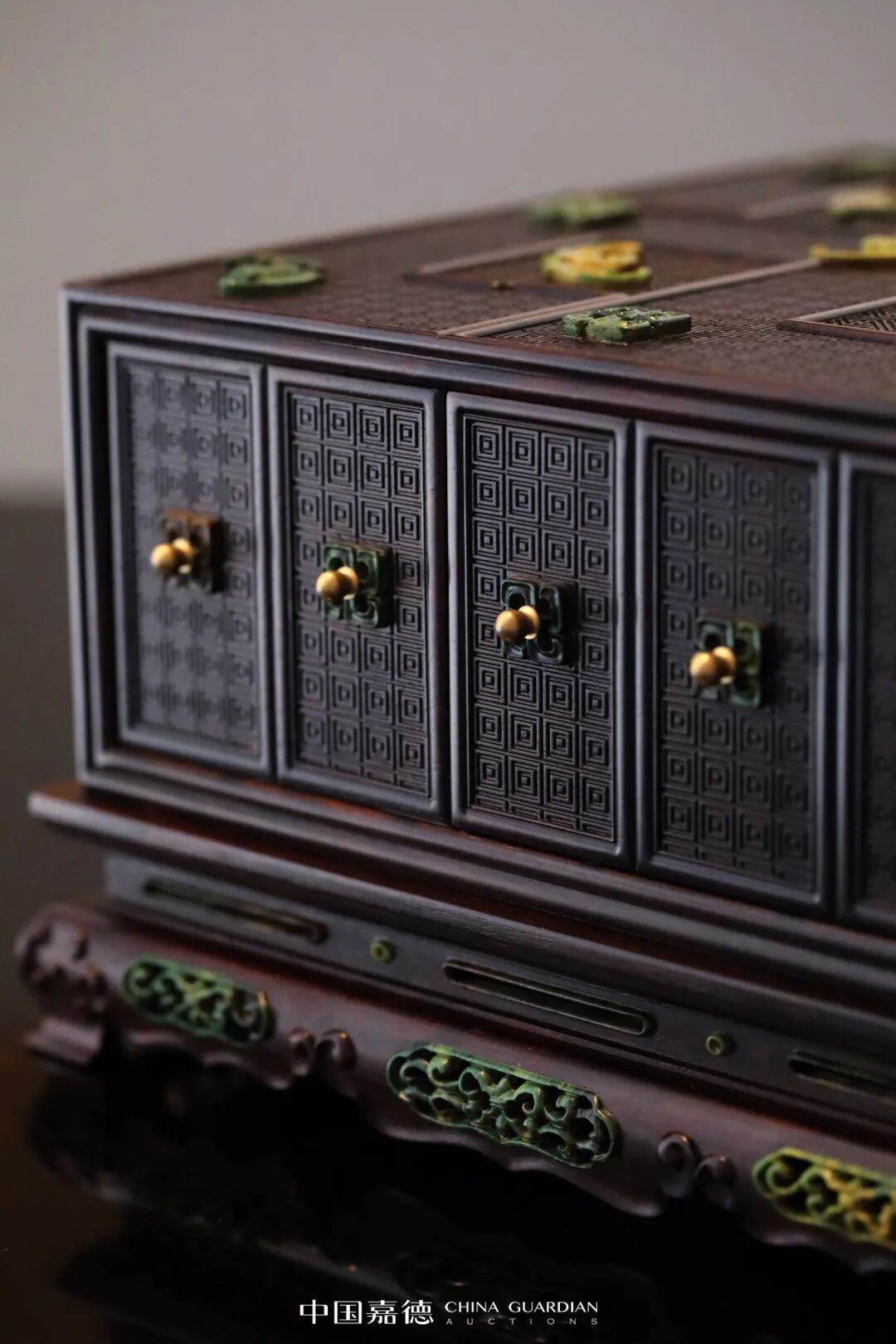 盒身整体以两种变形回纹为地,取意“万代永续”。侧壁四面做抽屉,抽屉划分小格,每格抽钮亦做万字纹。整器承乾隆华贵风格,可藏纳文房小物。托座与盒体相叠可旋转,设计巧妙,为实用佳器,兼富艺术性与趣味性。Lot 10136