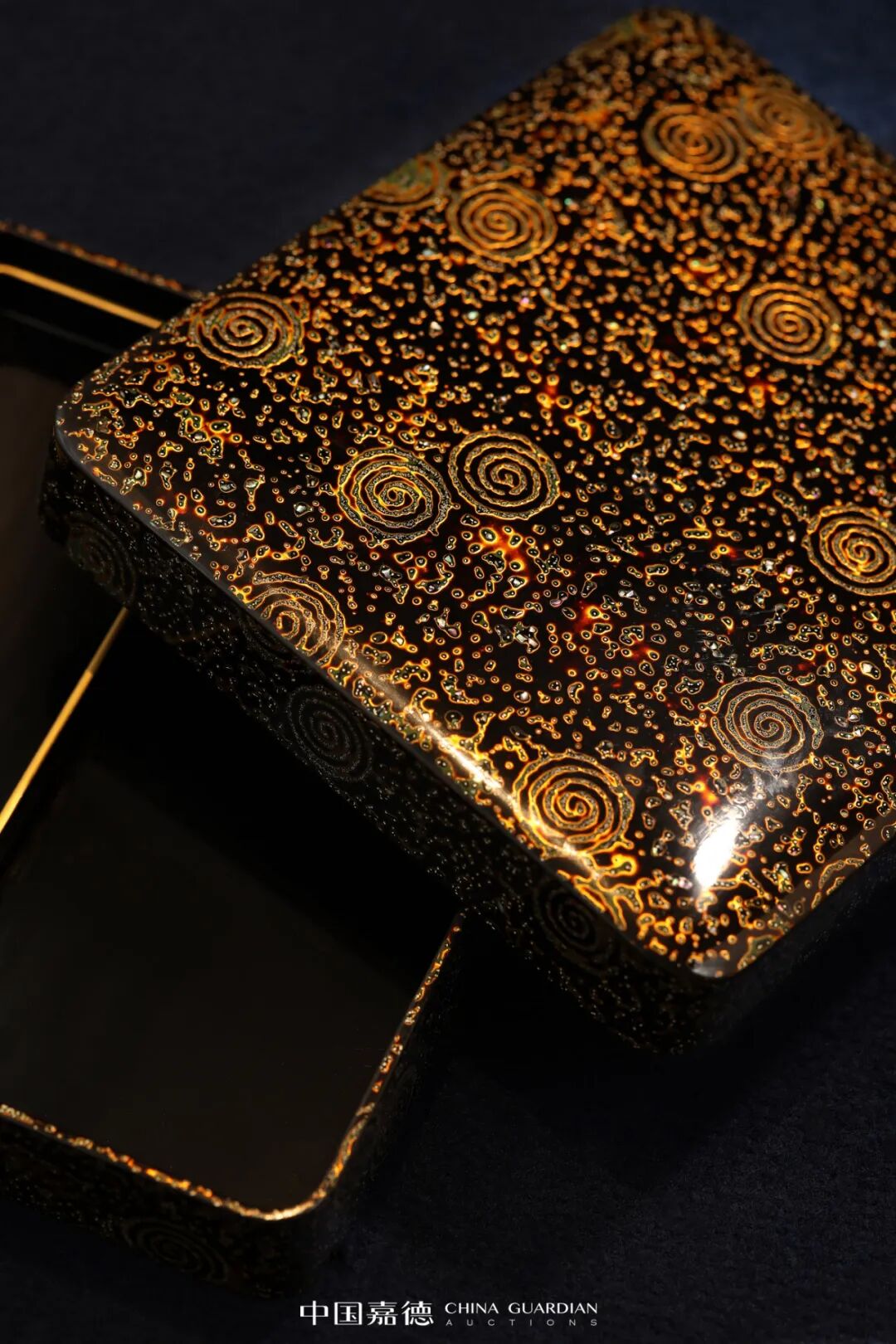 茶叶盒面包顶,内及底均髹黑漆,其上色彩流动,绚烂如星空,有菠萝漆之效。