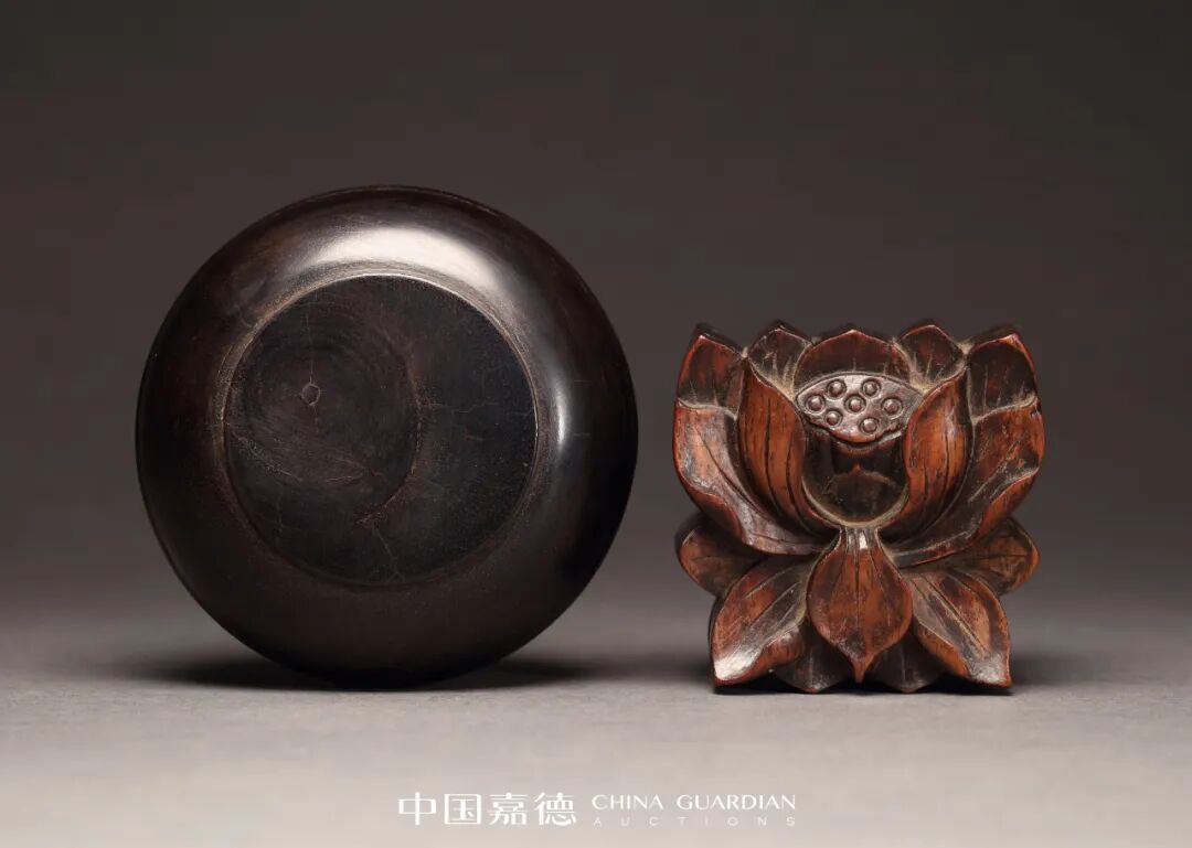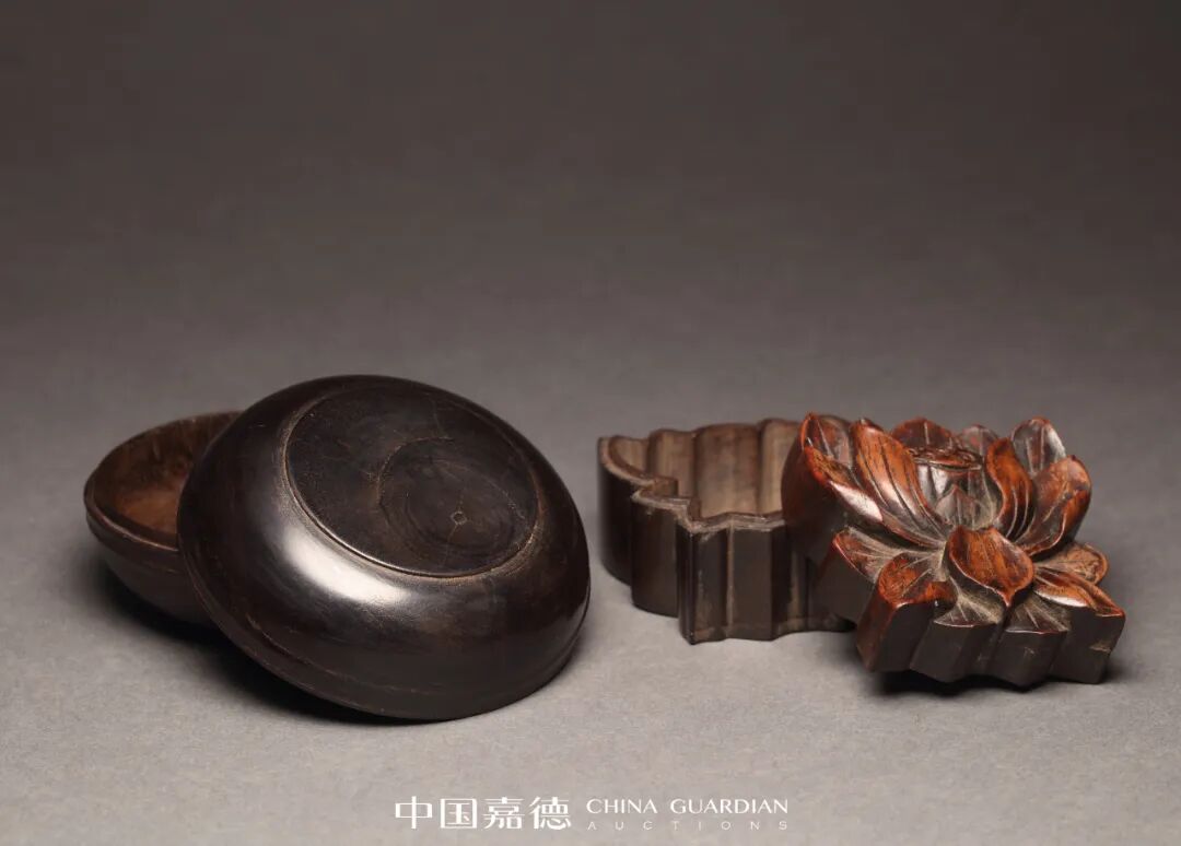 香盒两件,扁圆形者为紫檀制,色泽玄紫,棕孔清晰,器形规整素雅,口沿皮条线并加以打洼,子母口,内部器底圆形加厚,整器线条洗练,虽为素器,但用线极为讲究。另一香盒为莲花形,盒面深雕,花瓣娇柔清俊,整器皆随盒面之莲花形,转角爽利,精工之作。