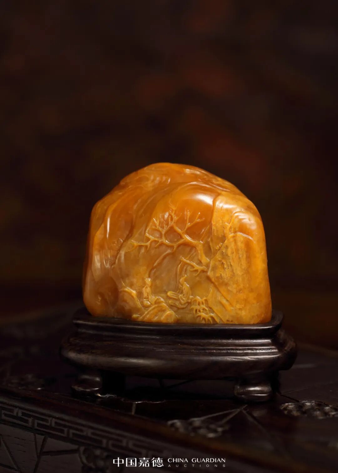 此件寿山田黄石摆件,形随天然,薄雕山间高士论道之景,枯木石间横出,树下二人对坐,一人抚琴,一人聆听,闲情逸致,山间清风,层岩叠嶂,楼阁掩映,草木丰茂,意境悠远。Lot10020