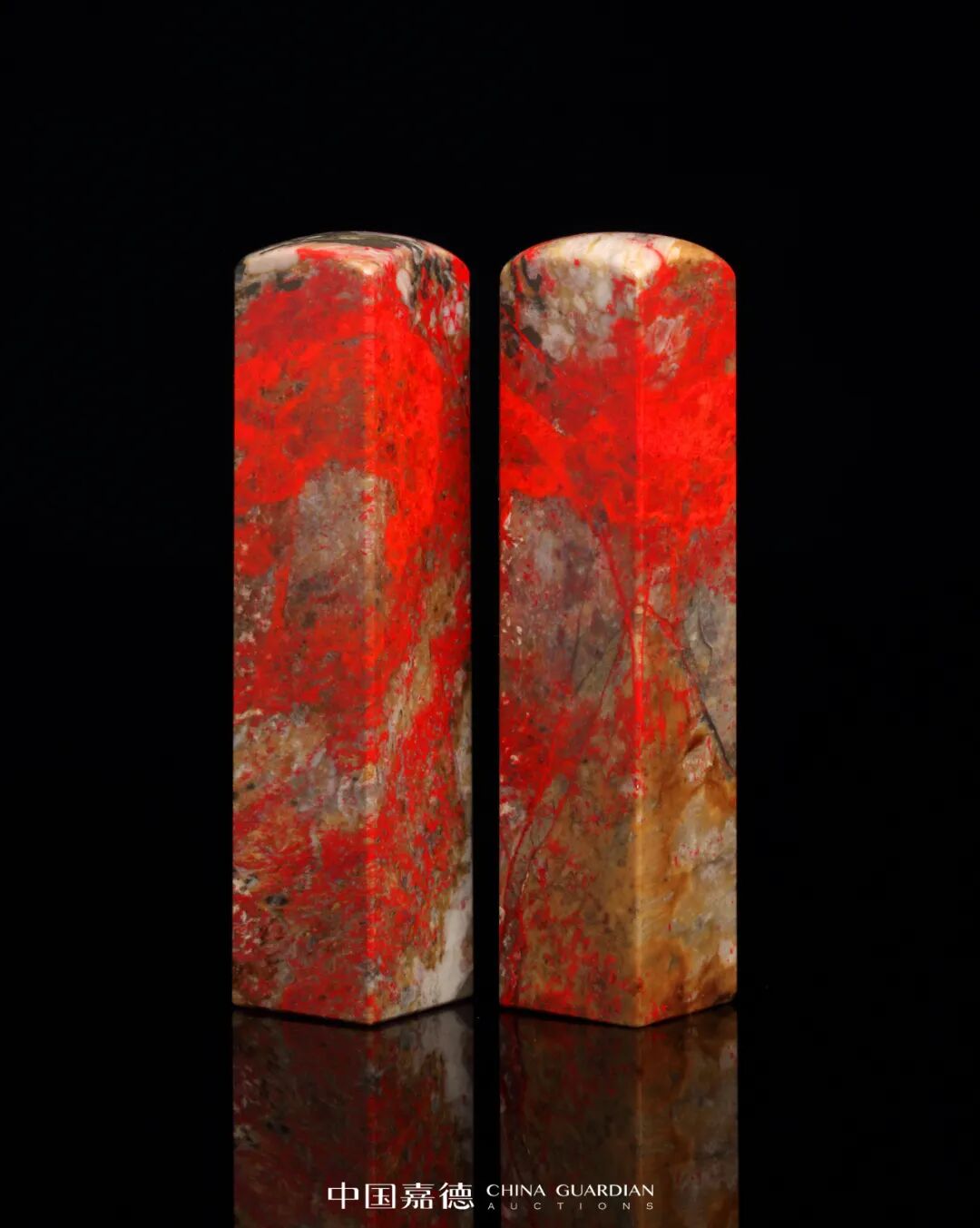 此对昌化鸡血石方章,自然顶,二者为一石之料,血色丝网状,虬结盘错于上部,黑、白、赭三色泼洒绚丽,独得自然造化之高妙。