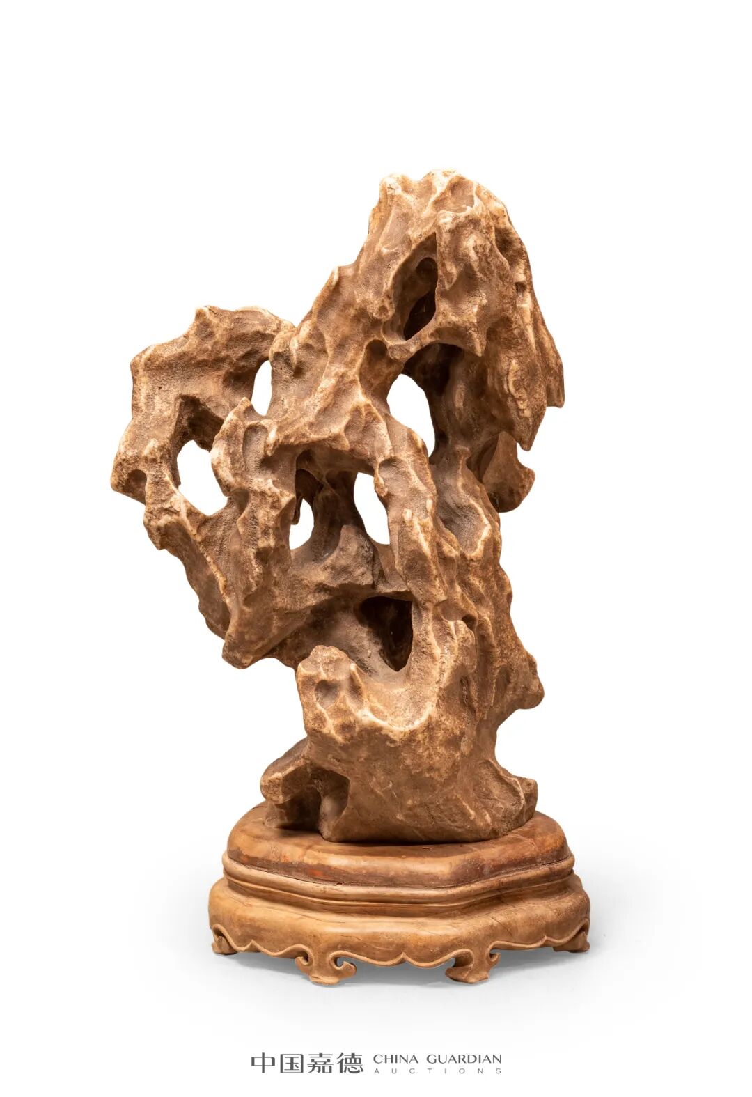 汉白玉立峰赏石,体量硕大,可为庭院陈设。石色苍然,石棱之处可见汉白玉莹白之骨,孔洞疏风漏月,峰峦俊秀,中部丰腴,近底收束,得文人雅趣。配木质束腰如意足底座,气韵极佳。