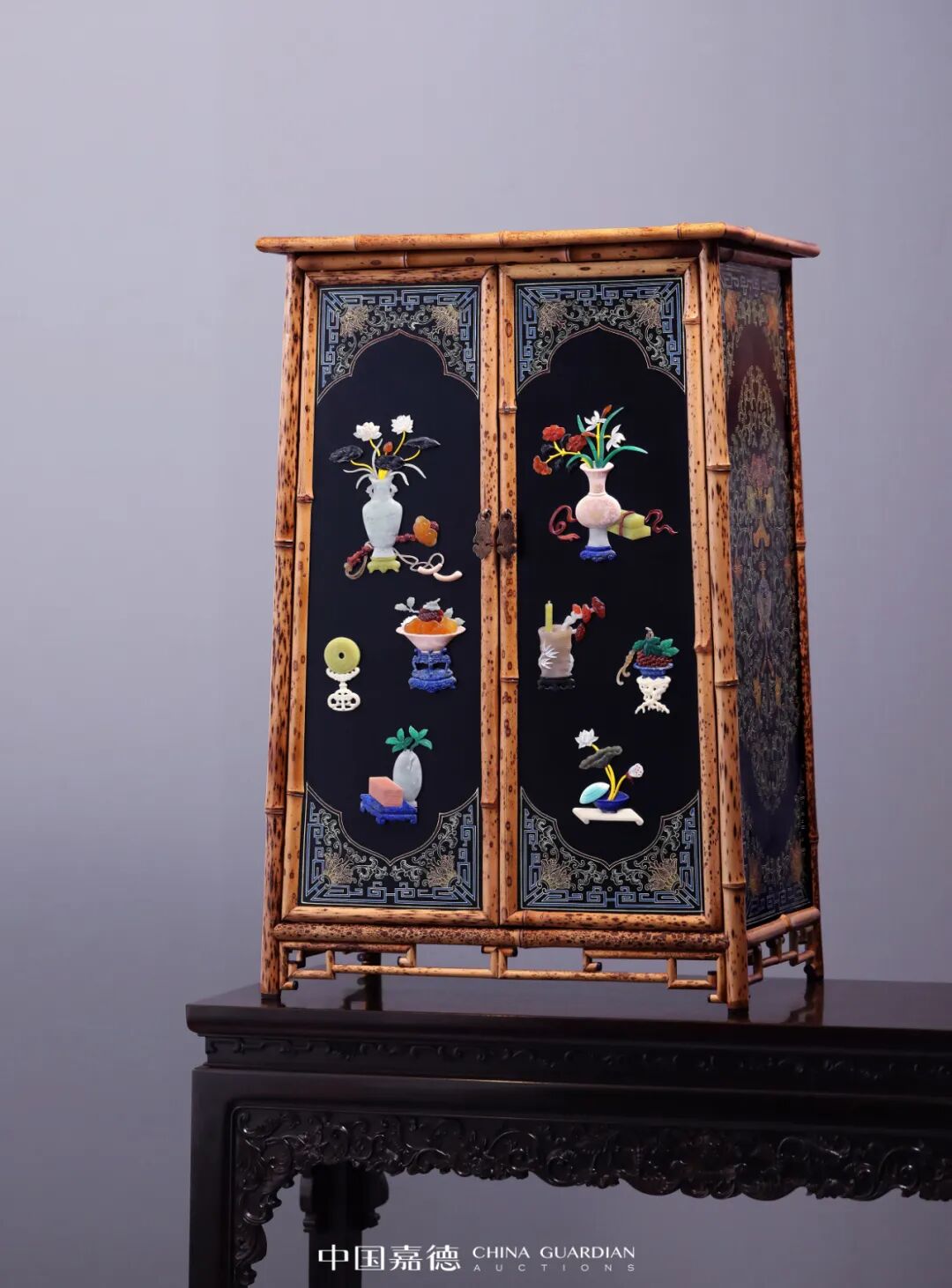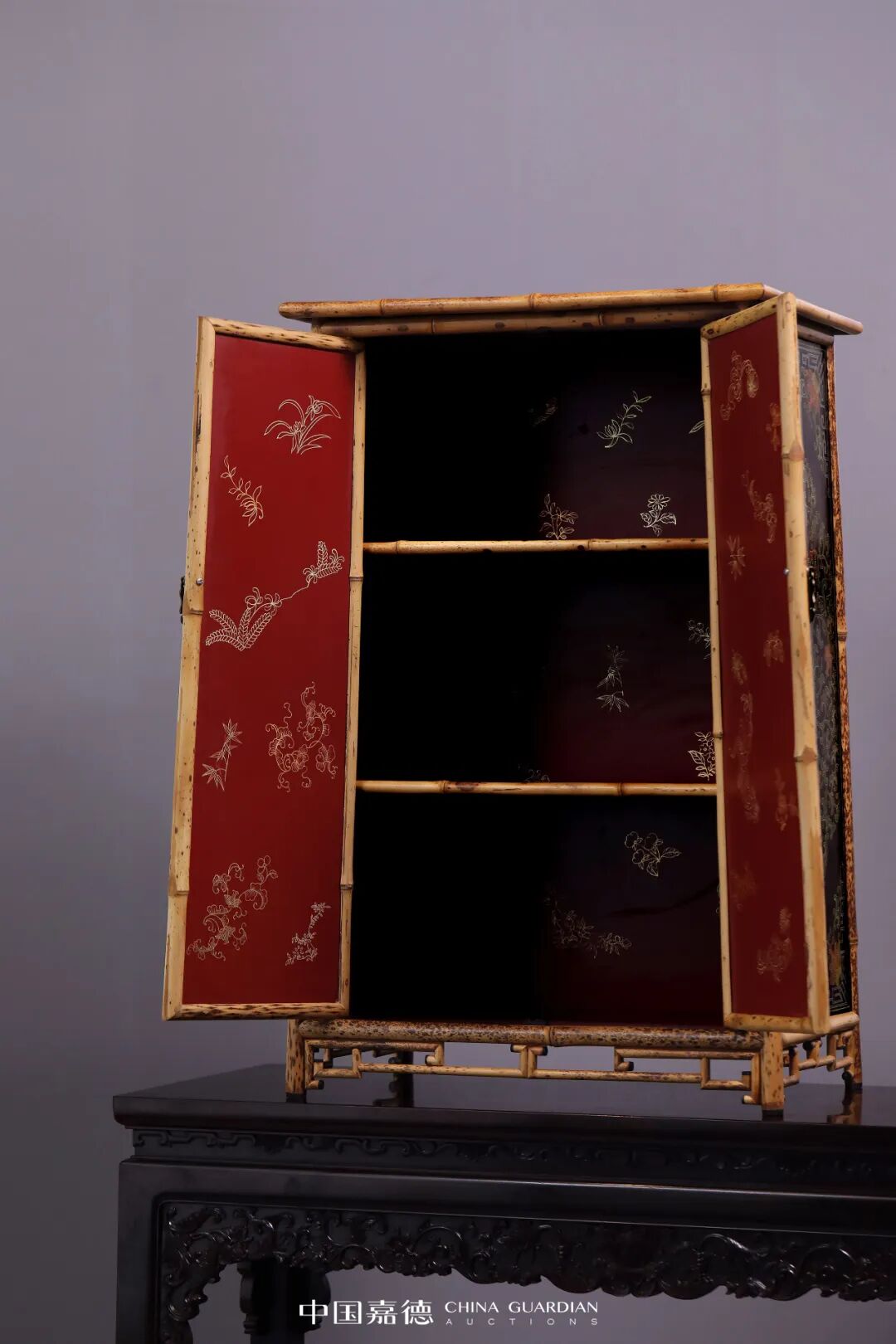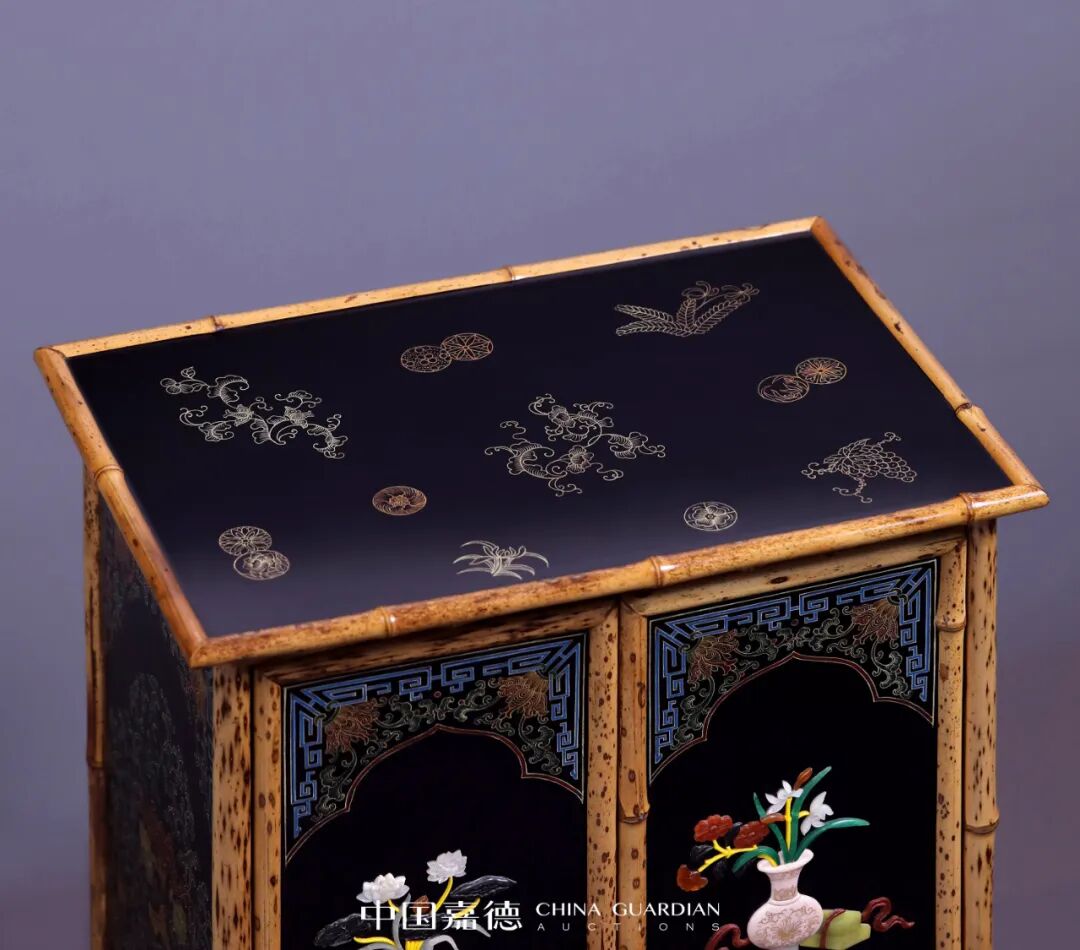 茶柜斑竹制,圆角柜样式,工艺考究。柜帽喷出,四根腿足纳入柜顶边框,整器呈A字形,无闩杆。柜顶、背板、侧板及门板均髹黑漆,其上嵌百宝博古器,同时彩绘宝相花,华丽异常。柜顶以描金技法饰皮球花。