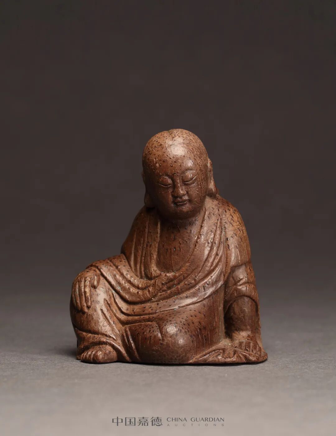 造像以竹根为材,质地细密,色泽沉稳静穆,圆雕佛像,双耳垂肩,发丝分束于耳后形成两小髻,面貌丰腴,双目微阖,浅含笑意,娴静之态,呈自在坐,右膝曲起,左足半趺,一手扶膝一手撑地,潇洒肆意之姿,衣褶自然舒展,古朴自然。