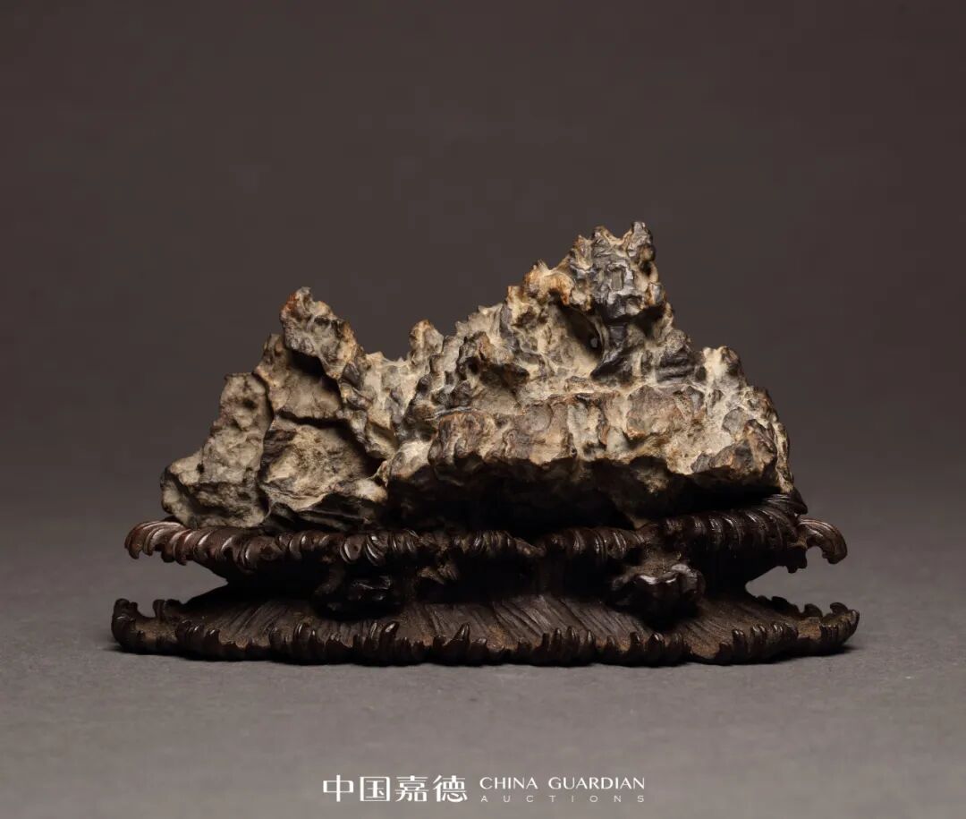 英石砚山,石色青白,表面褶皱嶙峋,沟壑纵横,双峰对峙之形,峰峦平缓,雄奇突兀。底承紫檀海水纹座,浪花翻涌,极为细腻,浪底藏有鱼虾小蟹,更添灵动生机,恰为“寿山福海”之态。