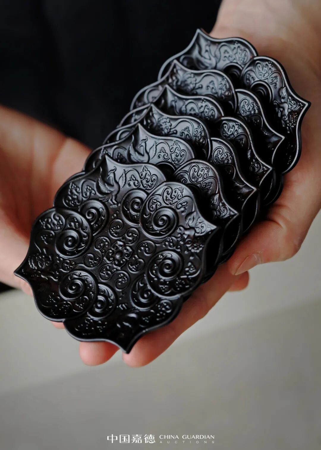 葵花形、圆形、菱花形茶托三套,每套均六支,皆以紫光檀制作,运用浮雕、阴刻工艺满雕兽面、云头等纹饰,细腻美观,十分趁手。