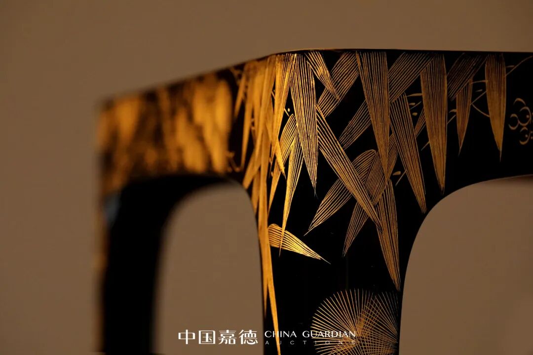 茶棚在正式茶席上扮演极为重要的角色,可将主人收藏的茶具做一个完美的显现。此茶棚为四方座形,顶部髹红漆,设拦水线;其余黑漆,黑漆地上采用沈金工艺描绘松竹梅君子图,有谦谦君子之风,遒劲枝干、花蕊、松针均刻画写实,雅致美观。沈金又叫沉金,是在漆器上刻画出金色的线条和细点,并使金色沉于刻纹,必须使用雕刻漆面专用的沈金刀,在打磨完成的漆面上雕出具有凹痕的纹饰。