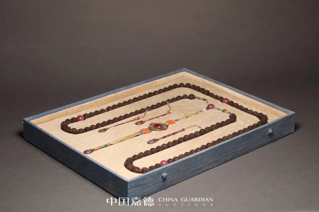 朝珠以沉香为材,每颗皆满雕寿字纹,大小均匀饱满圆润,雕工精湛,以四个紫色碧玺为结珠等分,以黄绦与背云相连,累丝背云镶嵌碧玺,上下珊瑚色蝙蝠形结牌,坠角亦为紫色碧玺,朝珠有纪念三串,每串穿碧玺十粒,配色雅致,尊贵华美。